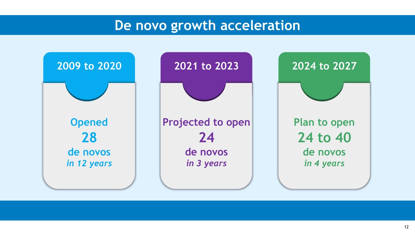 De novo growth acceleration 2009 to 2020 Opened 28 de novos in 12 years 2021 to 2023 Projected to open 24 de novos in 3 years 2024 to 2027 Plan to open 24 to 40 de novos in 4 years 12