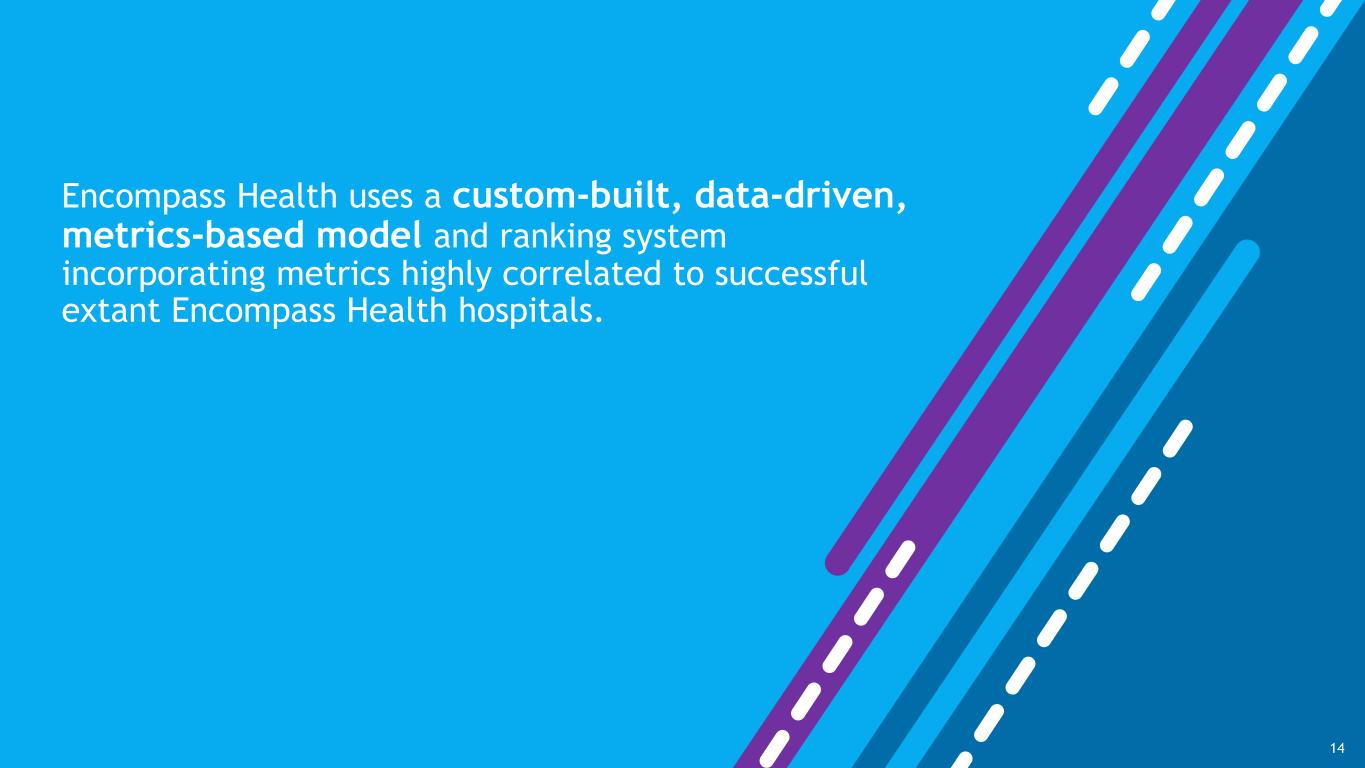 Encompass Health uses a custom-built, data-driven, metrics-based model and ranking system incorporating metrics highly correlated to successful extant Encompass Health hospitals. 14