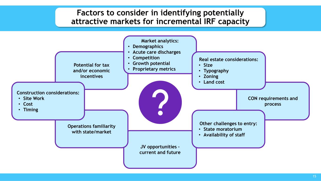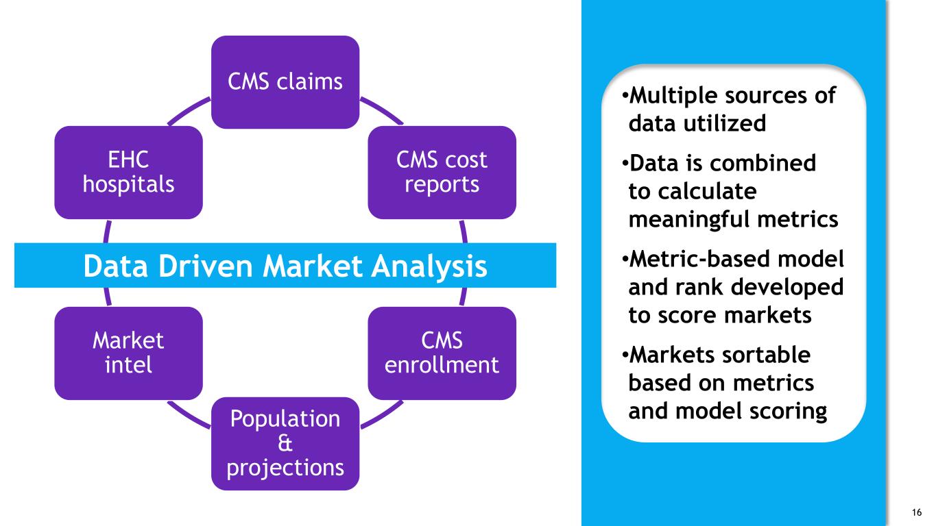 Potential for tax and/or economic incentives Factors to consider in identifying potentially attractive markets for incremental IRF capacity JV opportunities – current and future Operations familiarity with state/market Construction considerations: • Site Work • Cost • Timing CON requirements and process Market analytics: • Demographics • Acute care discharges • Competition • Growth potential • Proprietary metrics Other challenges to entry: • State moratorium • Availability of staff Real estate considerations: • Size • Typography • Zoning • Land cost 15