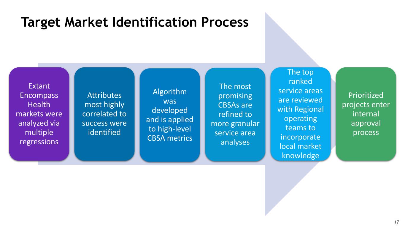 CMS claims CMS cost reports CMS enrollment Population & projections Market intel EHC hospitals •Multiple sources of data utilized •Data is combined to calculate meaningful metrics •Metric-based model and rank developed to score markets •Markets sortable based on metrics and model scoring Data Driven Market Analysis 16
