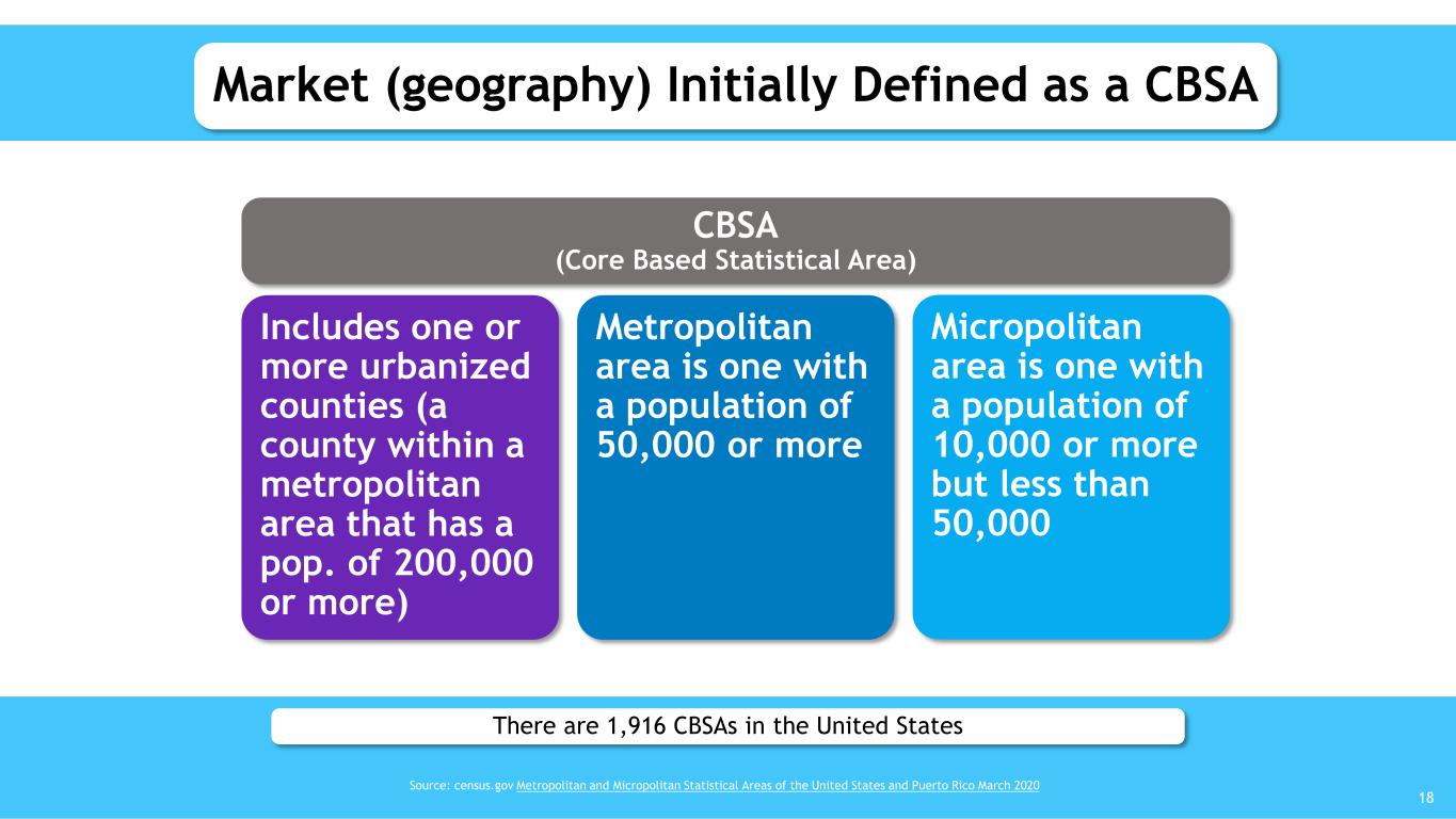 Market (geography) Initially Defined as a CBSA There are 1,916 CBSAs in the United States Source: census.gov Metropolitan and Micropolitan Statistical Areas of the United States and Puerto Rico March 2020 CBSA (Core Based Statistical Area) Includes one or more urbanized counties (a county within a metropolitan area that has a pop. of 200,000 or more) Metropolitan area is one with a population of 50,000 or more Micropolitan area is one with a population of 10,000 or more but less than 50,000 18