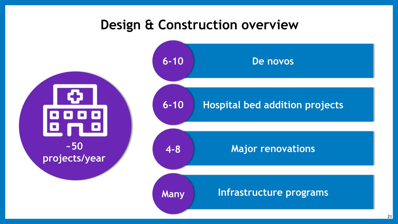 Design & Construction overview De novos Hospital bed addition projects Major renovations Infrastructure programs 6-10 6-10 4-8 Many ~50 projects/year 21