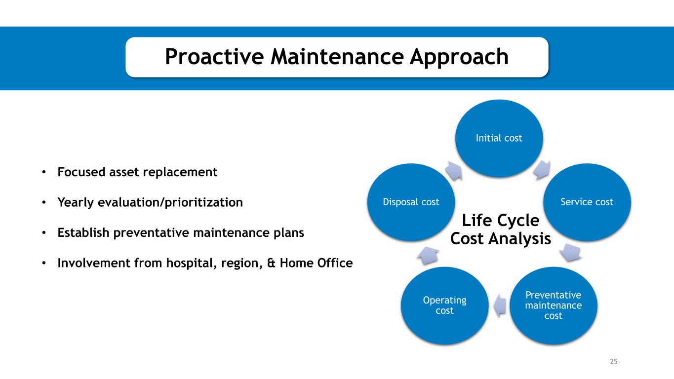 • Focused asset replacement • Yearly evaluation/prioritization • Establish preventative maintenance plans • Involvement from hospital, region, & Home Office 25 Initial cost Service cost Preventative maintenance cost Operating cost Disposal cost Life Cycle Cost Analysis Proactive Maintenance Approach