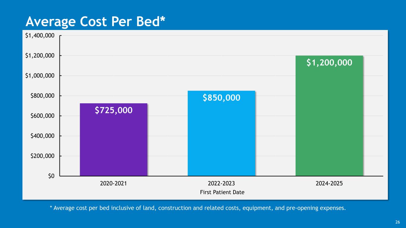 $725,000 $850,000 $1,200,000 $0 $200,000 $400,000 $600,000 $800,000 $1,000,000 $1,200,000 $1,400,000 2020-2021 2022-2023 2024-2025 First Patient Date Average Cost Per Bed* * Average cost per bed inclusive of land, construction and related costs, equipment, and pre-opening expenses. 26