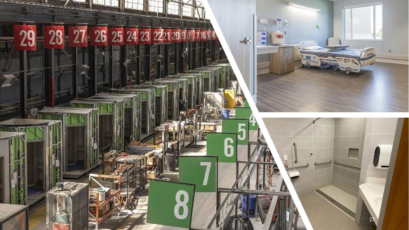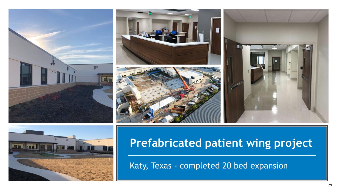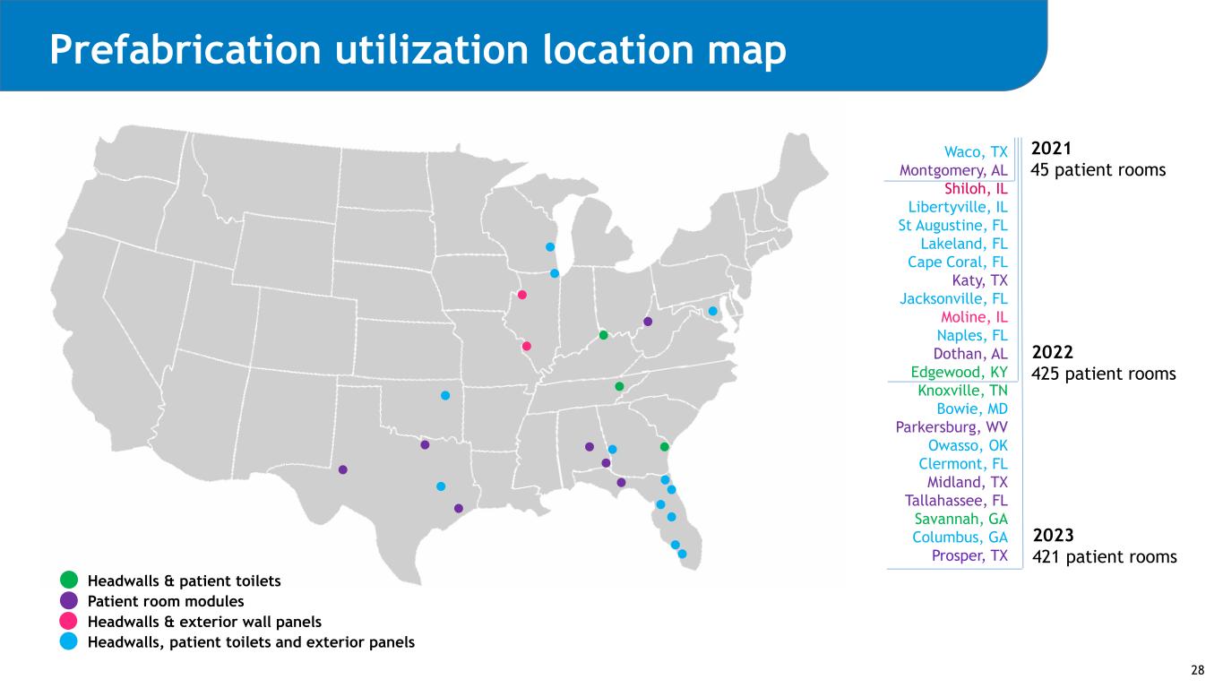 Prefabrication utilization location map Waco, TX Montgomery, AL Shiloh, IL Libertyville, IL St Augustine, FL Lakeland, FL Cape Coral, FL Katy, TX Jacksonville, FL Moline, IL Naples, FL Dothan, AL Edgewood, KY Knoxville, TN Bowie, MD Parkersburg, WV Owasso, OK Clermont, FL Midland, TX Tallahassee, FL Savannah, GA Columbus, GA Prosper, TX 2021 45 patient rooms 2022 425 patient rooms 2023 421 patient rooms Headwalls & patient toilets Patient room modules Headwalls & exterior wall panels Headwalls, patient toilets and exterior panels 28
