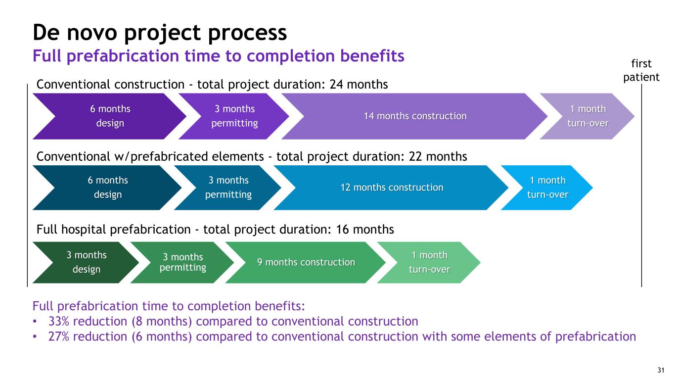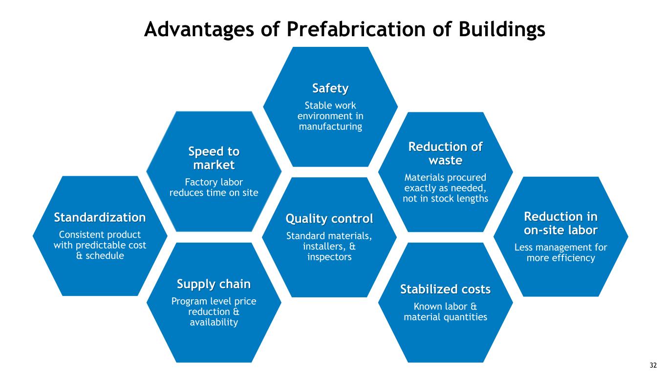 Full hospital prefabrication - total project duration: 16 months 6 months design 3 months permitting 12 months construction 1 month turn-over 3 months design 3 months permitting 9 months construction 1 month turn-over Conventional w/prefabricated elements - total project duration: 22 months first patient De novo project process Full prefabrication time to completion benefits 31Full prefabrication time to completion benefits: • 33% reduction (8 months) compared to conventional construction • 27% reduction (6 months) compared to conventional construction with some elements of prefabrication 6 months design 3 months permitting 14 months construction 1 month turn-over Conventional construction - total project duration: 24 months 31