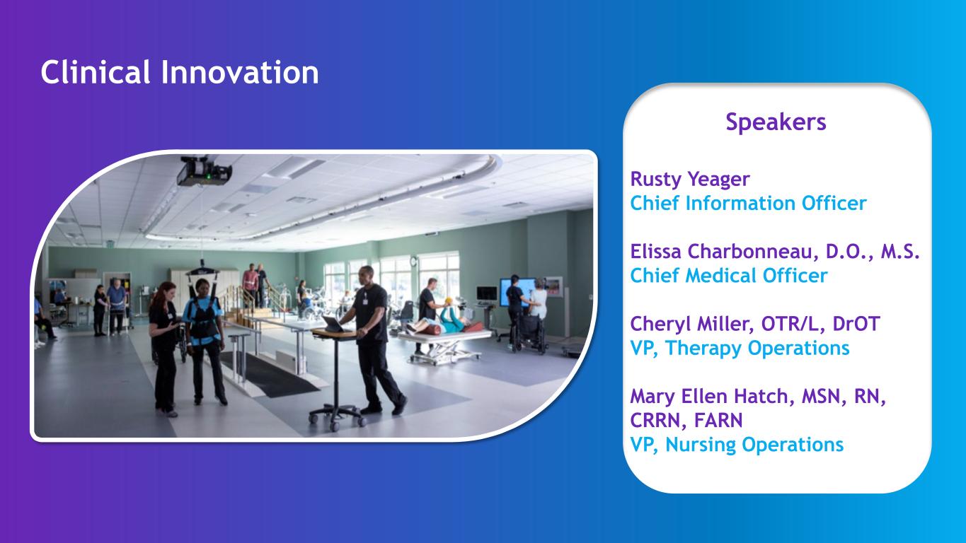 Speakers Clinical Innovation Rusty Yeager Chief Information Officer Elissa Charbonneau, D.O., M.S. Chief Medical Officer Cheryl Miller, OTR/L, DrOT VP, Therapy Operations Mary Ellen Hatch, MSN, RN, CRRN, FARN VP, Nursing Operations