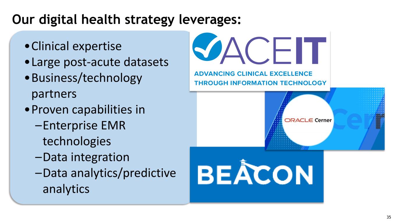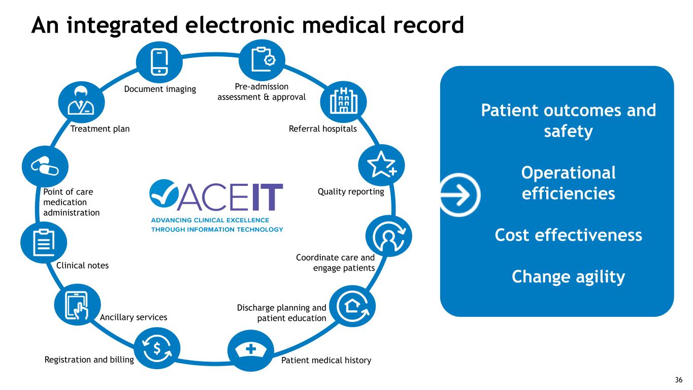 35 35 Post-acute innovation Lead the nation in patient-focused, evidenced-based models that improve outcomes and efficiencies PAYROLL GROUP PIC •Clinical expertise •Large post-acute datasets •Business/technology partners •Proven capabilities in –Enterprise EMR technologies –Data integration –Data analytics/predictive analytics Our digital health strategy leverages: 35