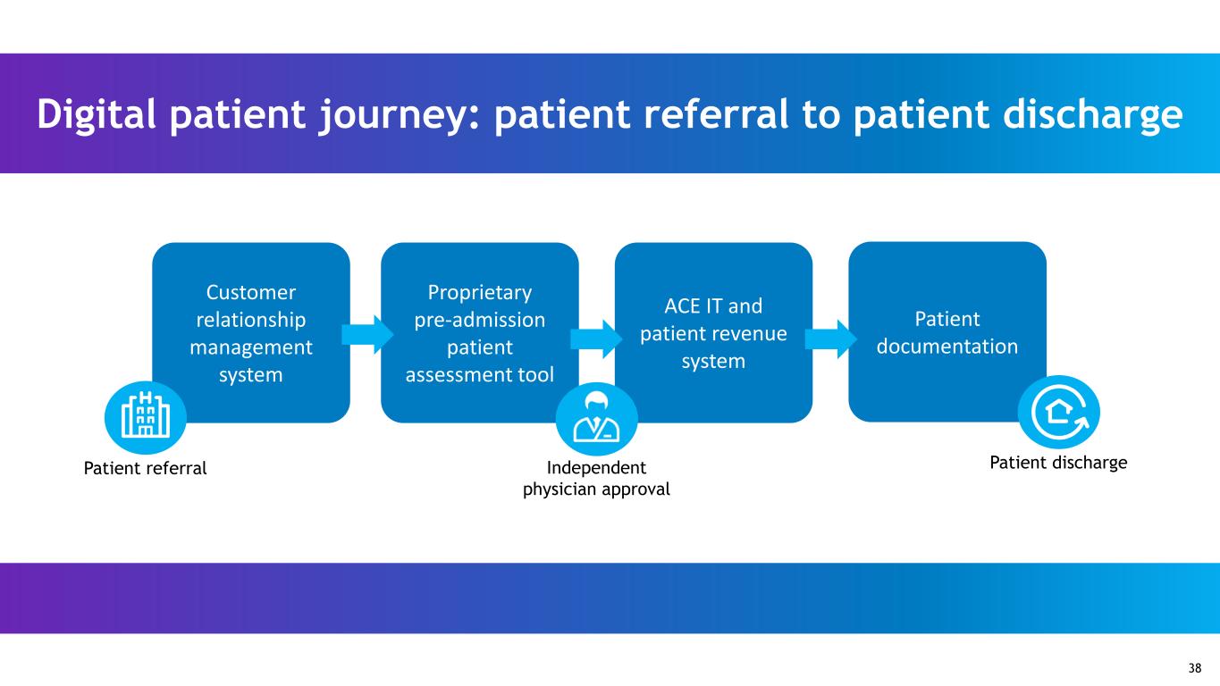 Patient documentation Customer relationship management system Proprietary pre-admission patient assessment tool ACE IT and patient revenue system Independent physician approval Patient dischargePatient referral 38 Digital patient journey: patient referral to patient discharge