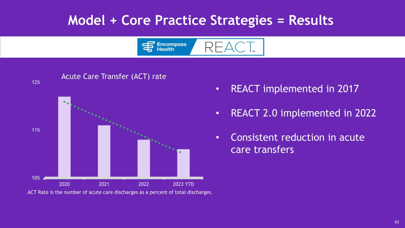 Model + Core Practice Strategies = Results 10% 11% 12% • REACT implemented in 2017 • REACT 2.0 implemented in 2022 • Consistent reduction in acute care transfers 43 ACT Rate is the number of acute care discharges as a percent of total discharges. Acute Care Transfer (ACT) rate