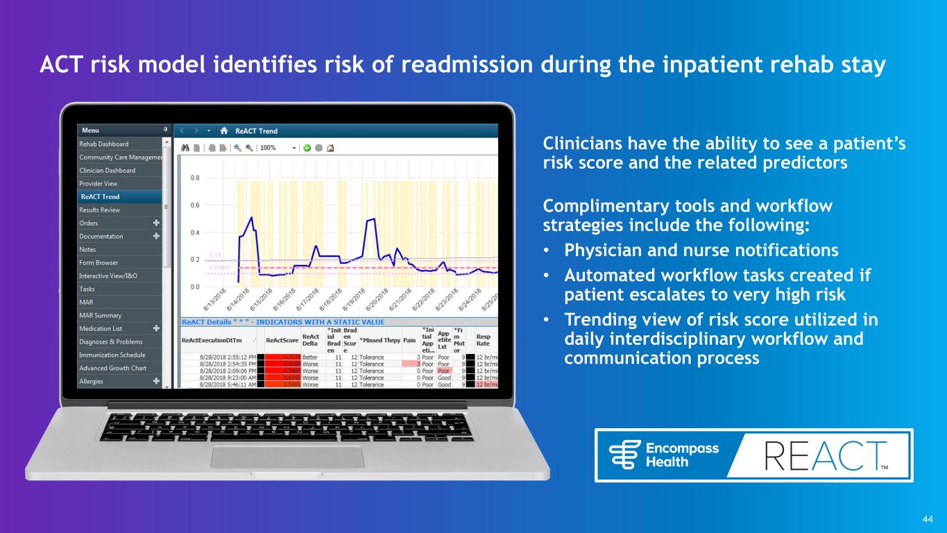 Clinicians have the ability to see a patient’s risk score and the related predictors Complimentary tools and workflow strategies include the following: • Physician and nurse notifications • Automated workflow tasks created if patient escalates to very high risk • Trending view of risk score utilized in daily interdisciplinary workflow and communication process ACT risk model identifies risk of readmission during the inpatient rehab stay 44