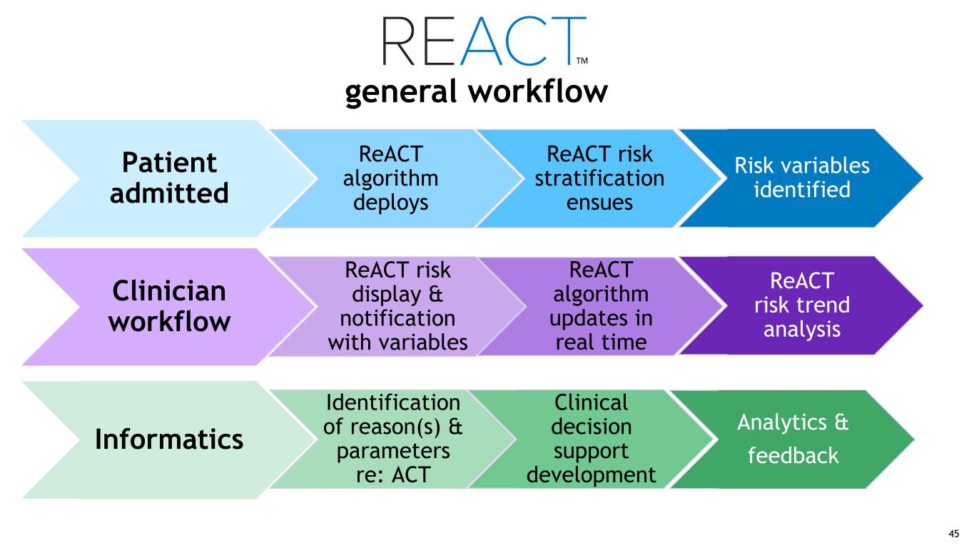 Patient admitted ReACT algorithm deploys ReACT risk stratification ensues Risk variables identified Clinician workflow ReACT risk display & notification with variables ReACT algorithm updates in real time ReACT risk trend analysis Informatics Identification of reason(s) & parameters re: ACT Clinical decision support development Analytics & feedback general workflow 45