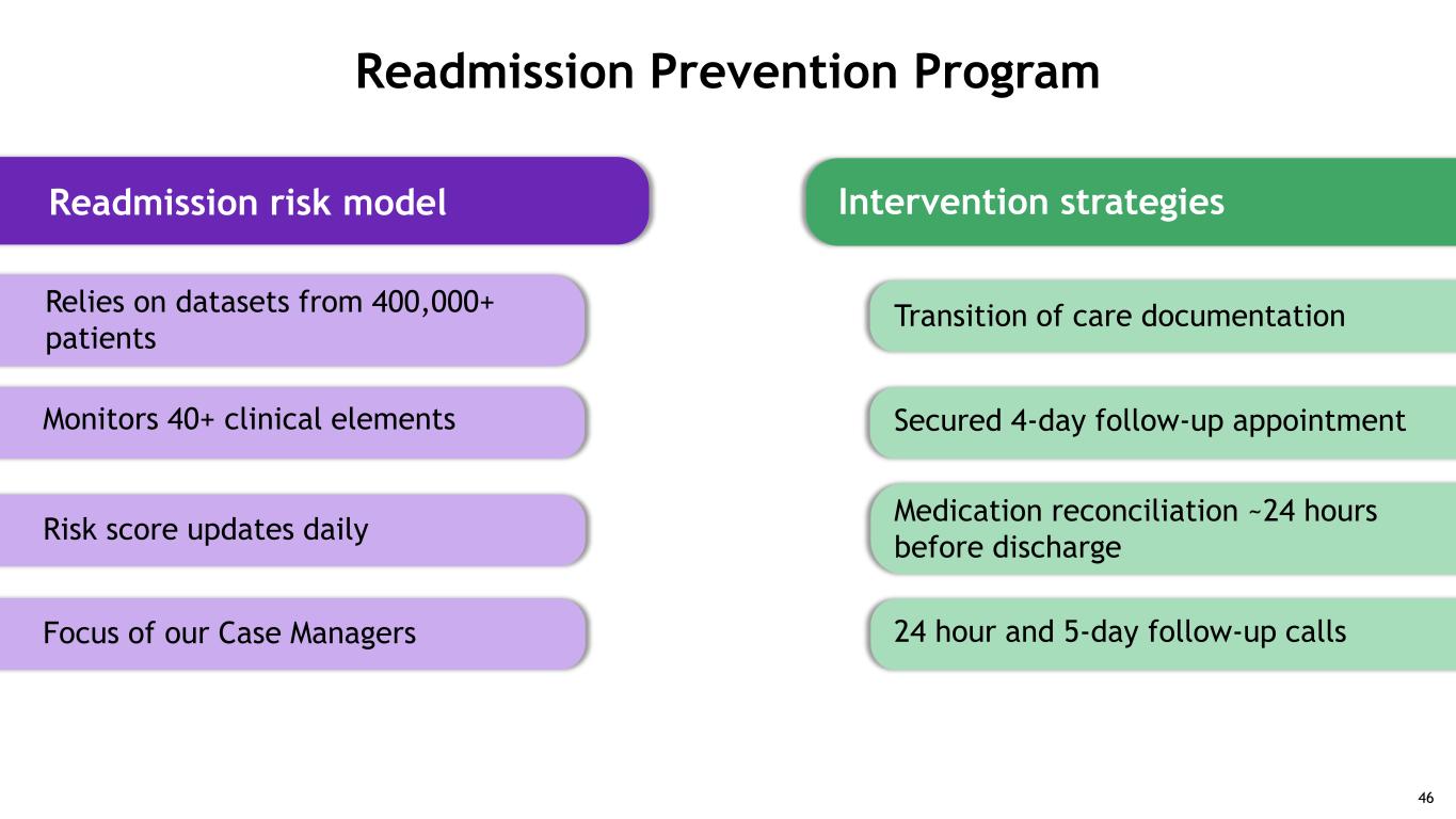 Readmission Prevention Program Relies on datasets from 400,000+ patients Readmission risk model Monitors 40+ clinical elements Risk score updates daily Focus of our Case Managers Transition of care documentation Secured 4-day follow-up appointment Medication reconciliation ~24 hours before discharge 24 hour and 5-day follow-up calls Intervention strategies 46