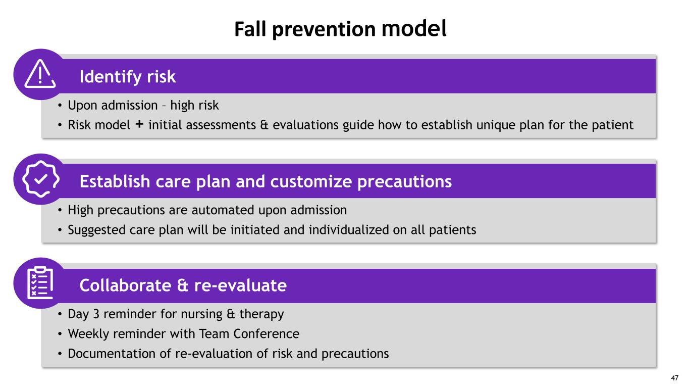 • Upon admission – high risk • Risk model + initial assessments & evaluations guide how to establish unique plan for the patient Fall prevention model Identify risk • High precautions are automated upon admission • Suggested care plan will be initiated and individualized on all patients Establish care plan and customize precautions • Day 3 reminder for nursing & therapy • Weekly reminder with Team Conference • Documentation of re-evaluation of risk and precautions Collaborate & re-evaluate 47
