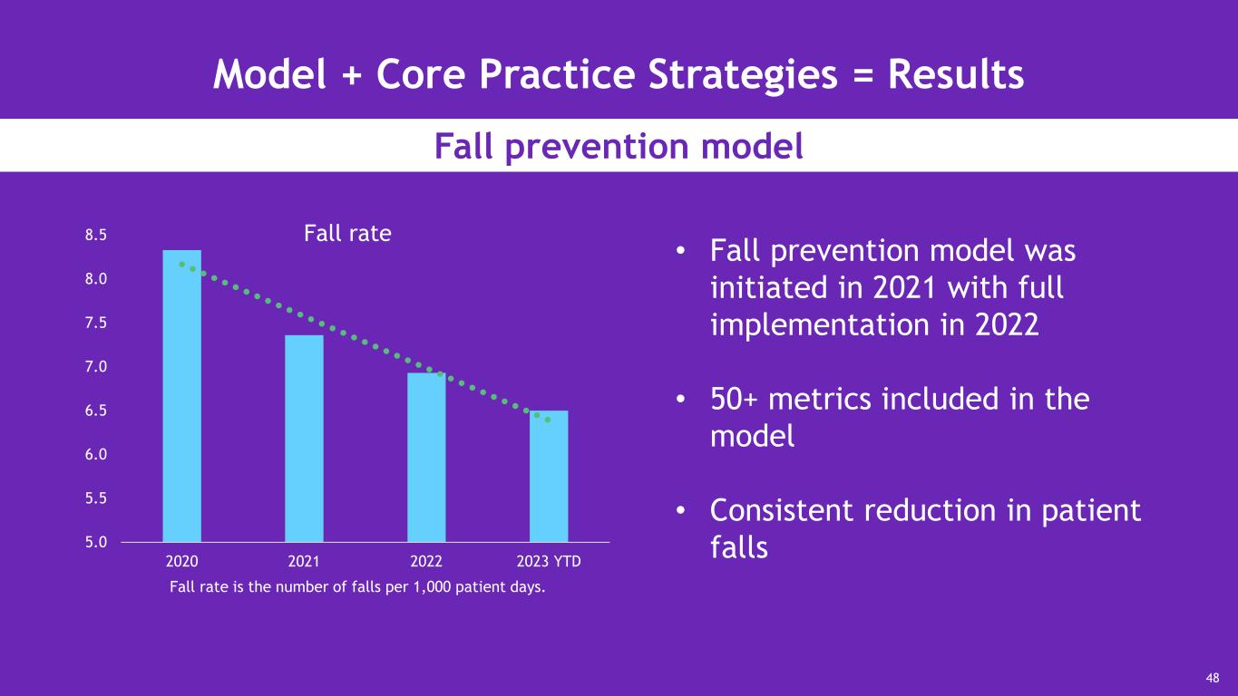 Model + Core Practice Strategies = Results Fall prevention model 5.0 5.5 6.0 6.5 7.0 7.5 8.0 8.5 2020 2021 2022 2023 YTD • Fall prevention model was initiated in 2021 with full implementation in 2022 • 50+ metrics included in the model • Consistent reduction in patient falls 48 Fall rate is the number of falls per 1,000 patient days. Fall rate