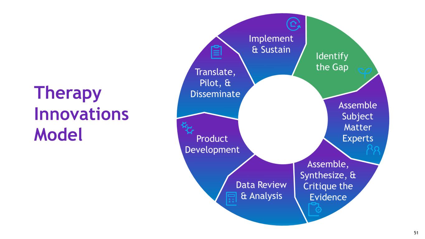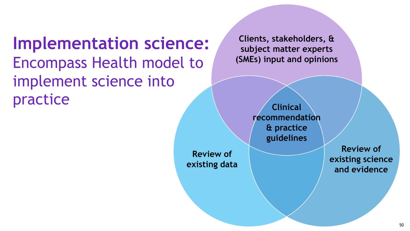 Implementation science: Encompass Health model to implement science into practice Clients, stakeholders, & subject matter experts (SMEs) input and opinions Review of existing data Review of existing science and evidence Clinical recommendation & practice guidelines 50