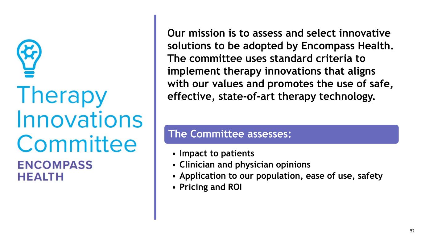Our mission is to assess and select innovative solutions to be adopted by Encompass Health. The committee uses standard criteria to implement therapy innovations that aligns with our values and promotes the use of safe, effective, state-of-art therapy technology. The Committee assesses: • Impact to patients • Clinician and physician opinions • Application to our population, ease of use, safety • Pricing and ROI 52