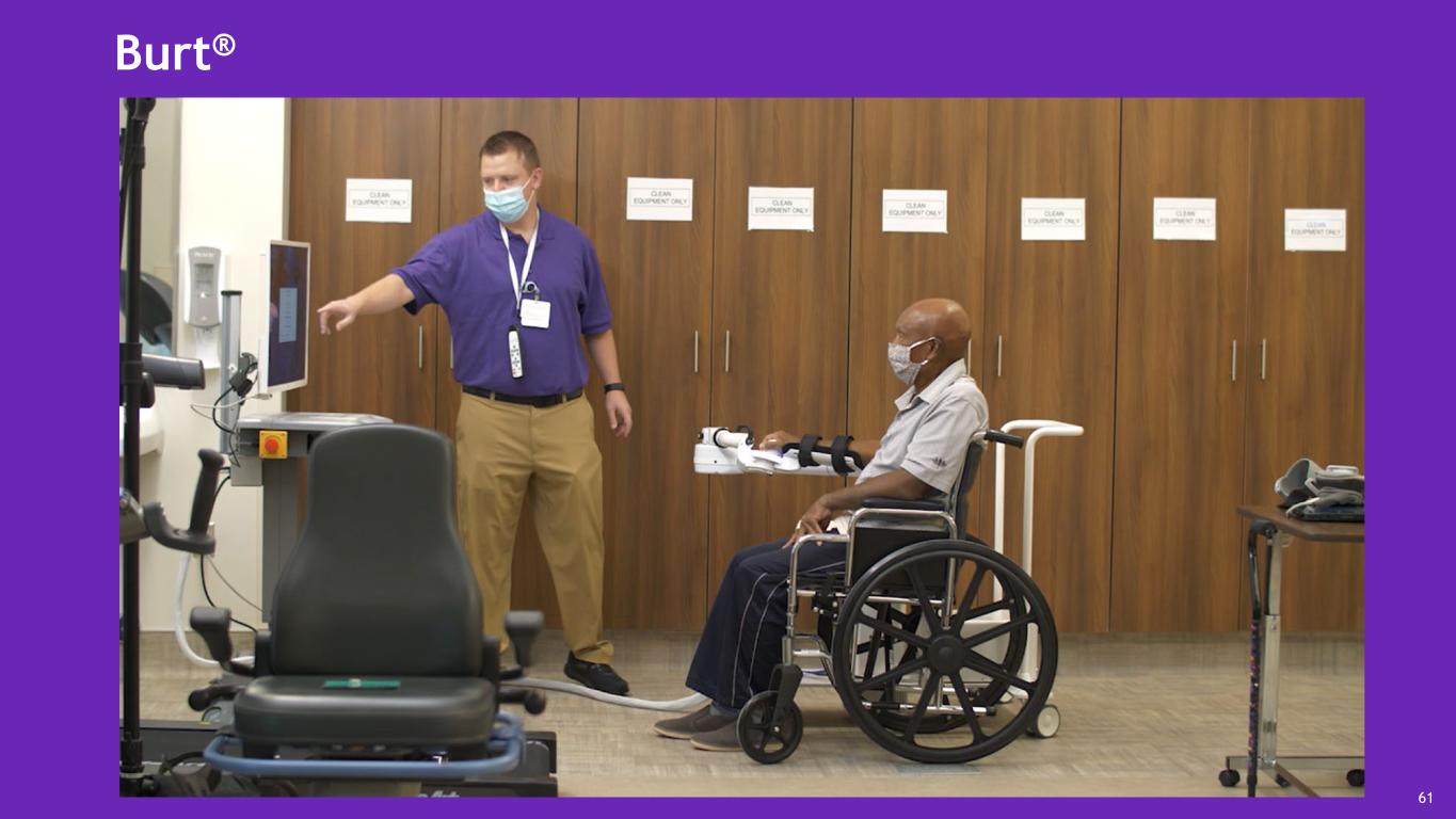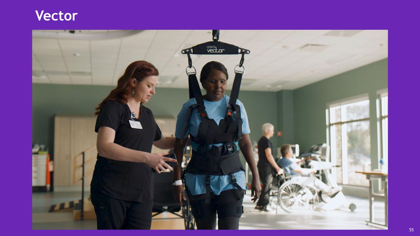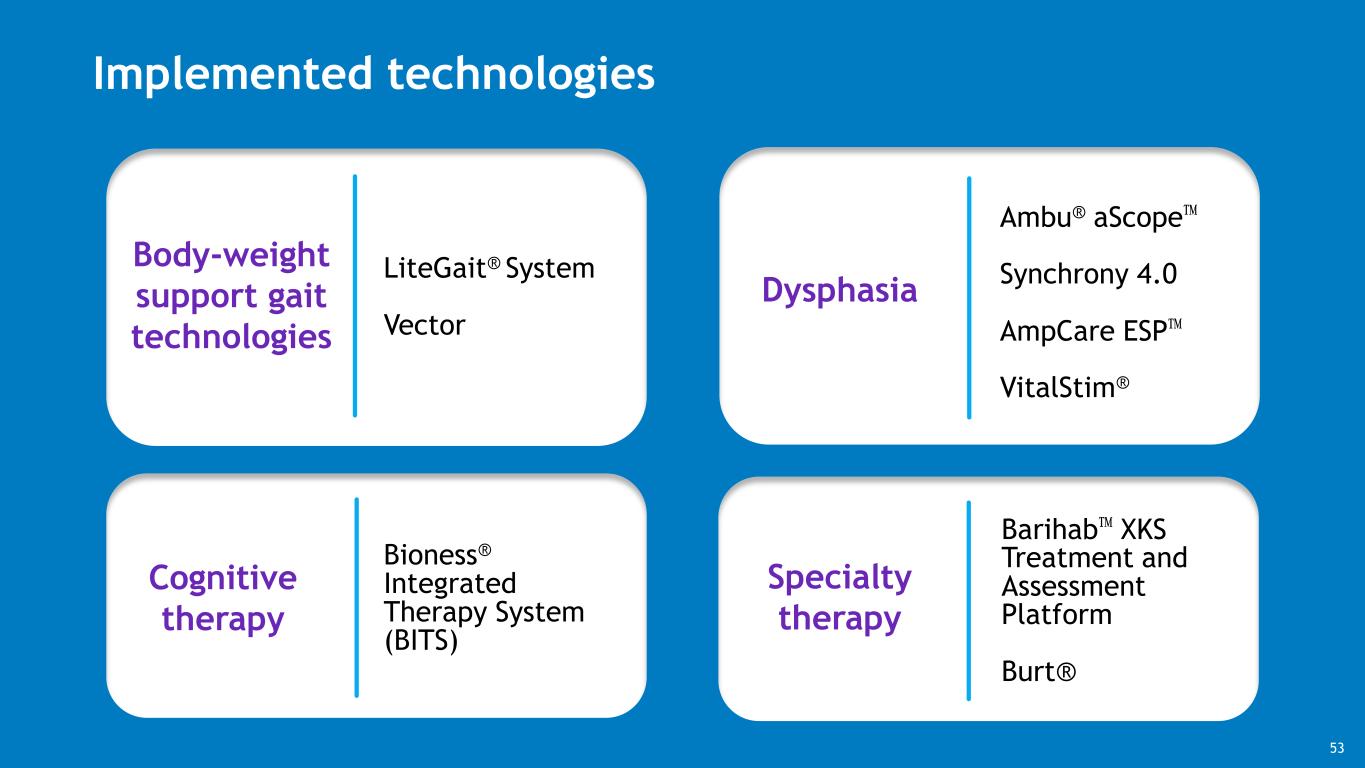 Body-weight support gait technologies Implemented technologies LiteGait® System Vector Ambu® aScope™ Synchrony 4.0 AmpCare ESP™ VitalStim® Dysphasia Cognitive therapy Bioness® Integrated Therapy System (BITS) Specialty therapy Barihab™ XKS Treatment and Assessment Platform Burt® 53