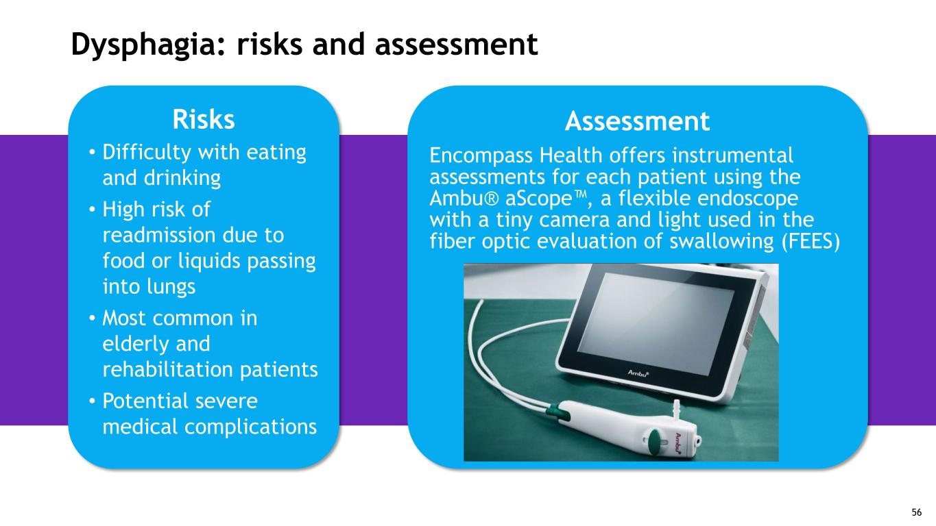 Dysphagia: risks and assessment Risks • Difficulty with eating and drinking • High risk of readmission due to food or liquids passing into lungs • Most common in elderly and rehabilitation patients • Potential severe medical complications Assessment Encompass Health offers instrumental assessments for each patient using the Ambu® aScope™, a flexible endoscope with a tiny camera and light used in the fiber optic evaluation of swallowing (FEES) 56