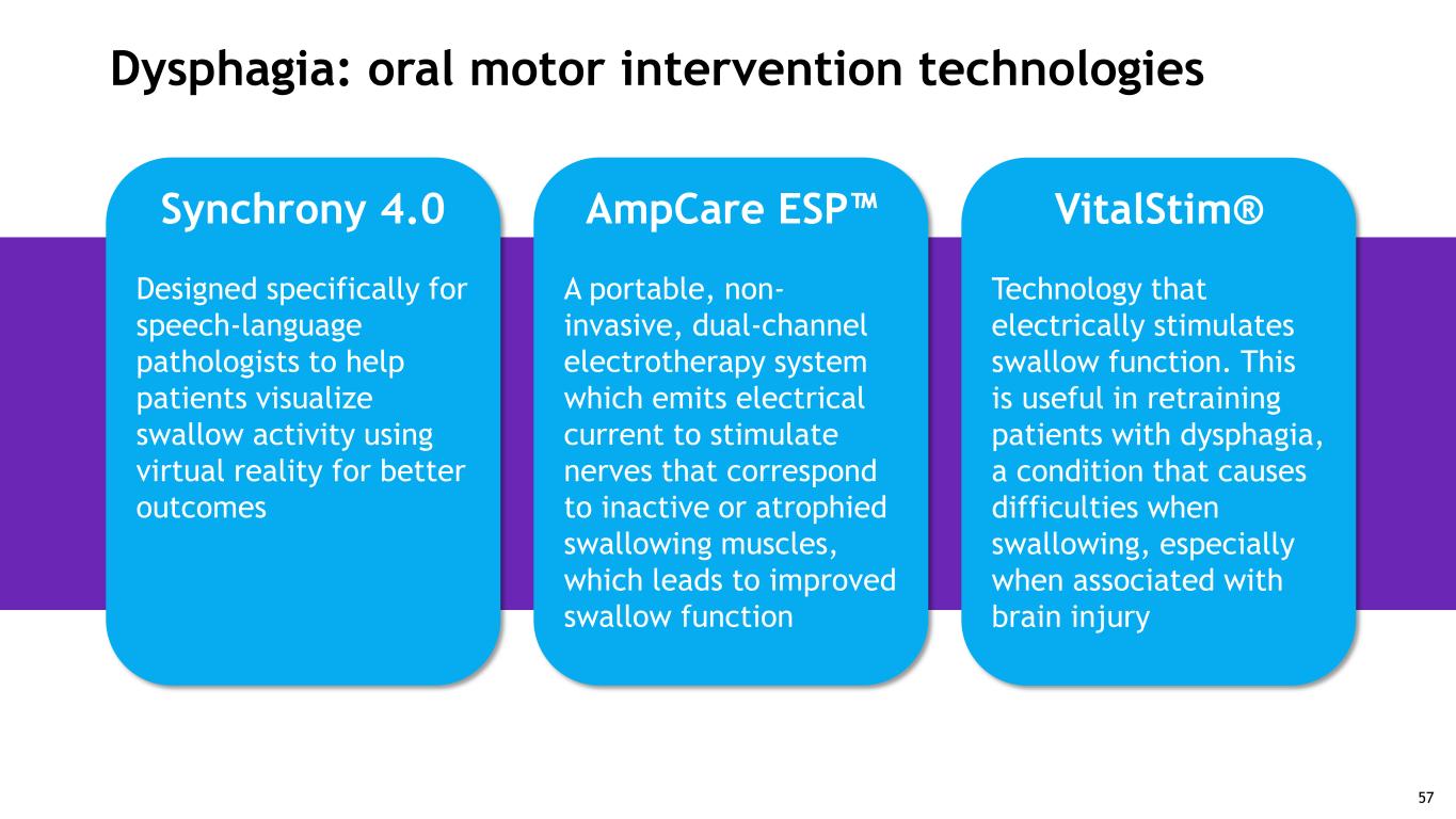 Dysphagia: oral motor intervention technologies Synchrony 4.0 Designed specifically for speech-language pathologists to help patients visualize swallow activity using virtual reality for better outcomes VitalStim® Technology that electrically stimulates swallow function. This is useful in retraining patients with dysphagia, a condition that causes difficulties when swallowing, especially when associated with brain injury AmpCare ESP™ A portable, non- invasive, dual-channel electrotherapy system which emits electrical current to stimulate nerves that correspond to inactive or atrophied swallowing muscles, which leads to improved swallow function 57