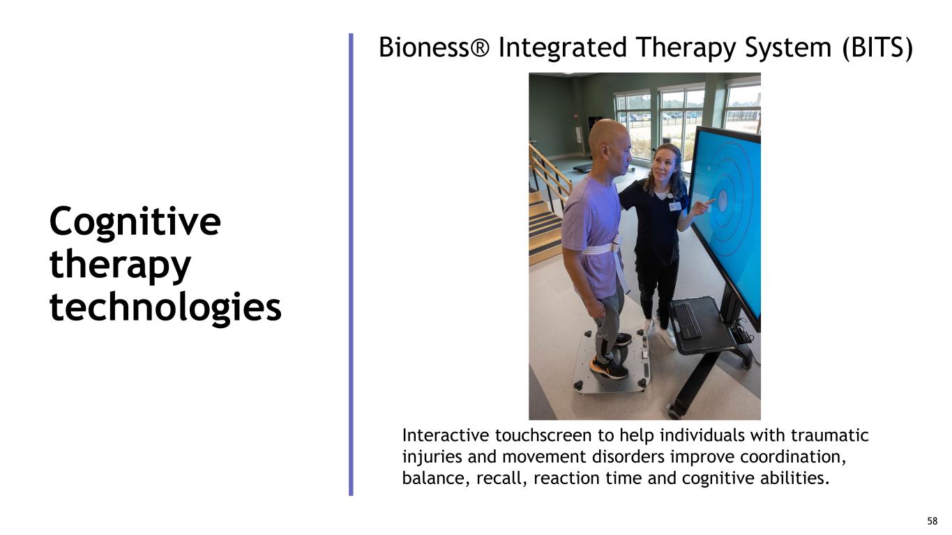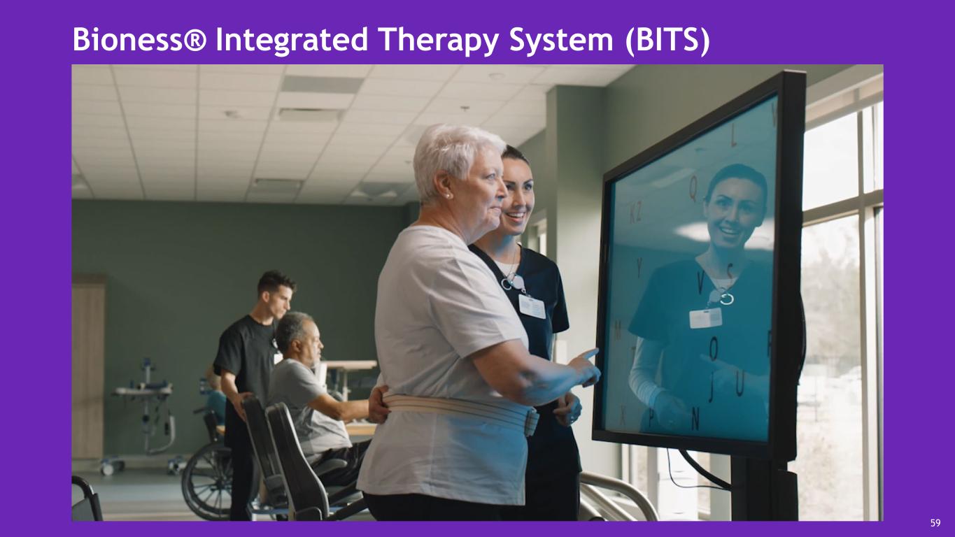 Cognitive therapy technologies Bioness® Integrated Therapy System (BITS) Interactive touchscreen to help individuals with traumatic injuries and movement disorders improve coordination, balance, recall, reaction time and cognitive abilities. 58