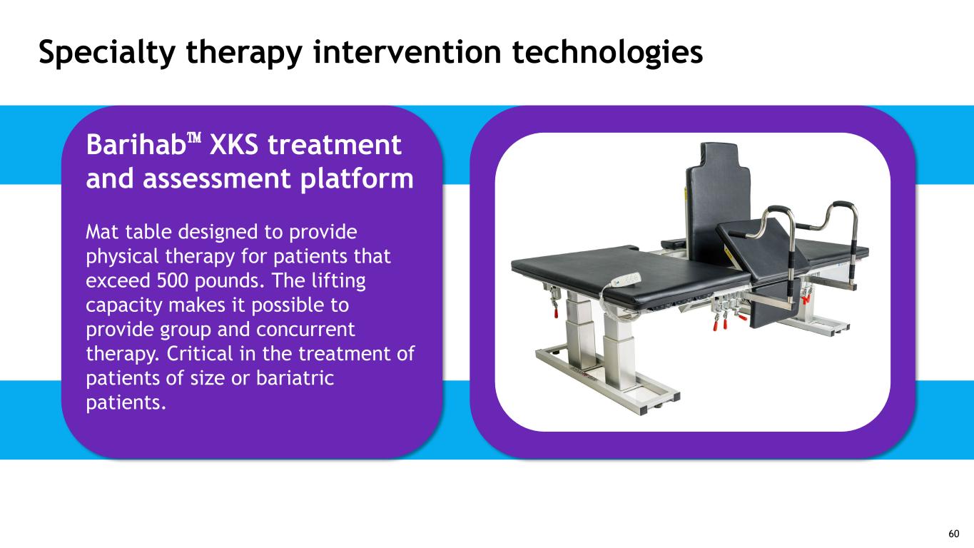 Specialty therapy intervention technologies Barihab™ XKS treatment and assessment platform Mat table designed to provide physical therapy for patients that exceed 500 pounds. The lifting capacity makes it possible to provide group and concurrent therapy. Critical in the treatment of patients of size or bariatric patients. 60
