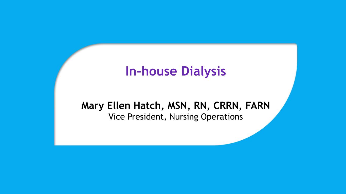 In-house Dialysis Mary Ellen Hatch, MSN, RN, CRRN, FARN Vice President, Nursing Operations