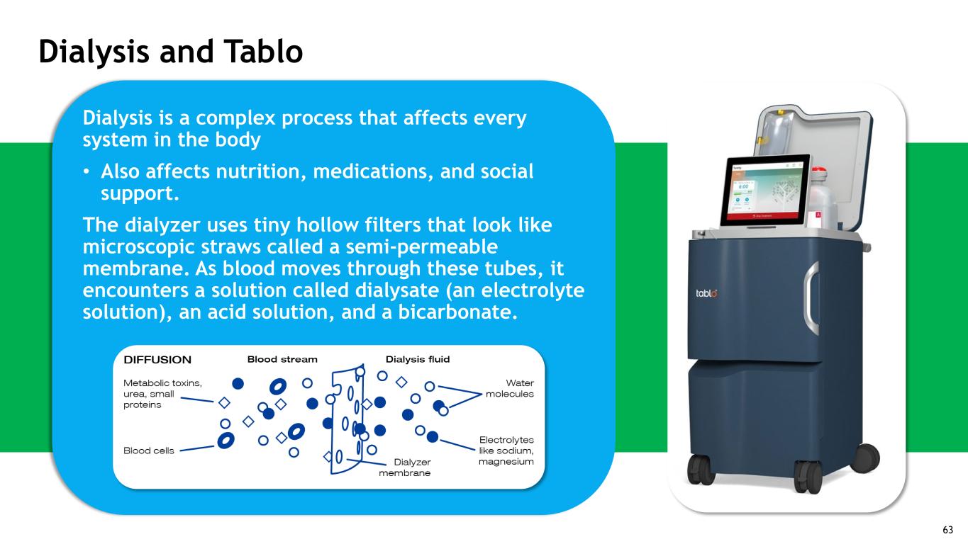 Dialysis and Tablo Dialysis is a complex process that affects every system in the body • Also affects nutrition, medications, and social support. The dialyzer uses tiny hollow filters that look like microscopic straws called a semi-permeable membrane. As blood moves through these tubes, it encounters a solution called dialysate (an electrolyte solution), an acid solution, and a bicarbonate. 63