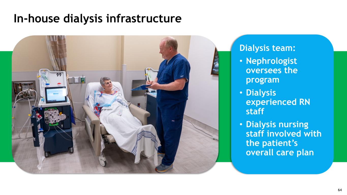 In-house dialysis infrastructure Dialysis team: • Nephrologist oversees the program • Dialysis experienced RN staff • Dialysis nursing staff involved with the patient’s overall care plan 64