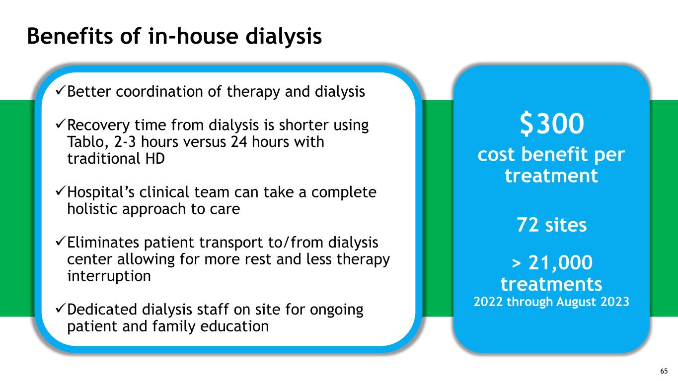 Benefits of in-house dialysis Better coordination of therapy and dialysis Recovery time from dialysis is shorter using Tablo, 2-3 hours versus 24 hours with traditional HD Hospital’s clinical team can take a complete holistic approach to care Eliminates patient transport to/from dialysis center allowing for more rest and less therapy interruption Dedicated dialysis staff on site for ongoing patient and family education $300 cost benefit per treatment 72 sites > 21,000 treatments 2022 through August 2023 65