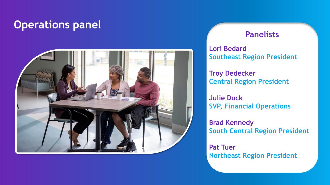 Operations panel Panelists Lori Bedard Southeast Region President Troy Dedecker Central Region President Julie Duck SVP, Financial Operations Brad Kennedy South Central Region President Pat Tuer Northeast Region President