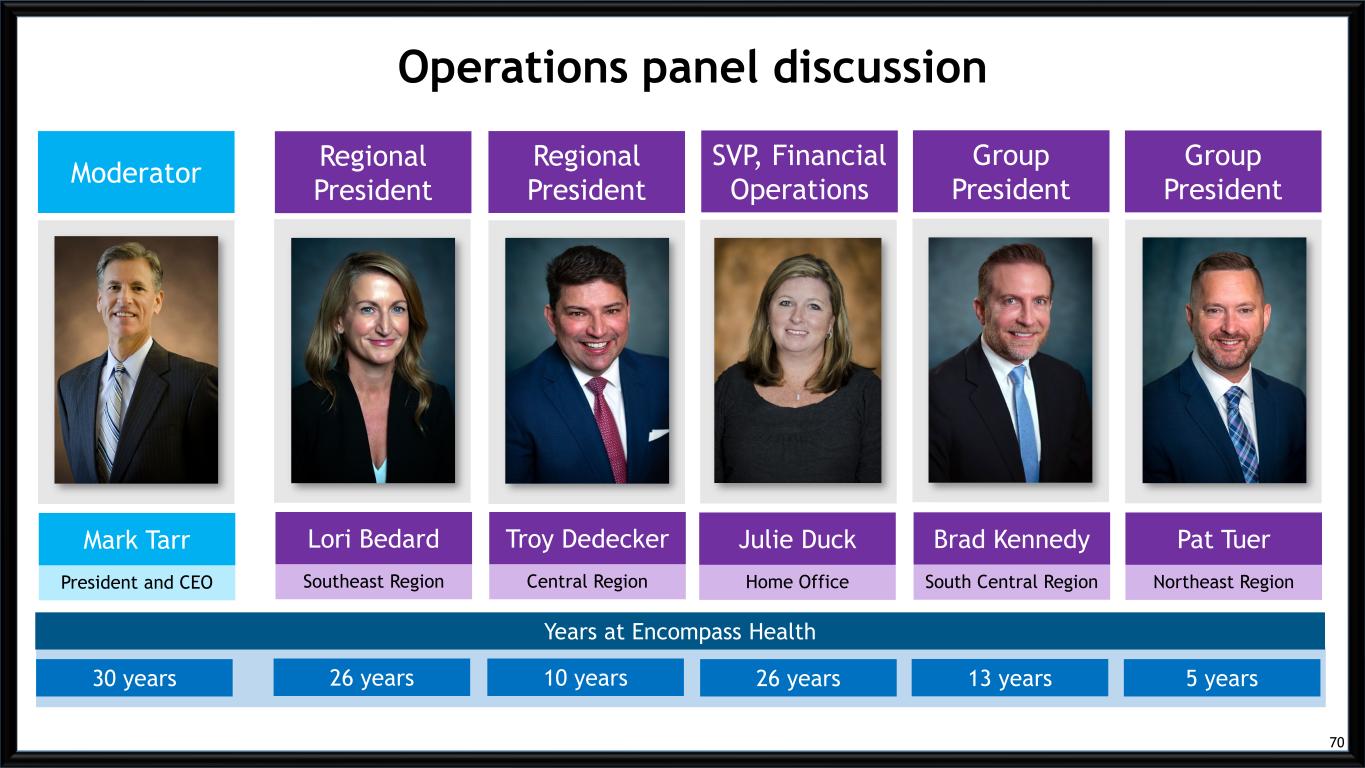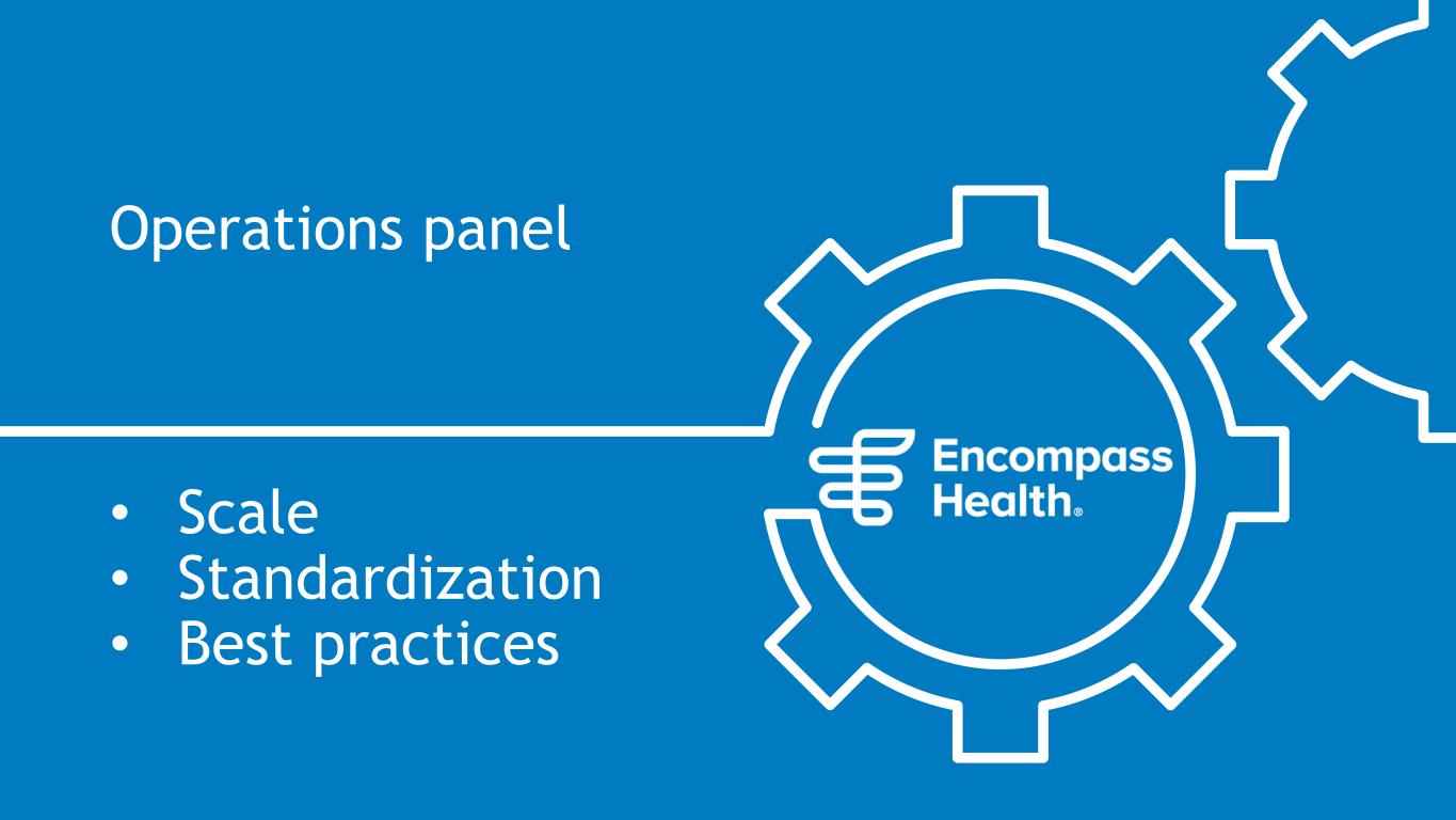 Operations panel discussion Moderator Regional President Regional President Group President Group President SVP, Financial Operations President and CEO Southeast Region Central Region South Central Region Northeast Region Home Office Years at Encompass Health 26 years 10 years 13 years 5 years26 years Mark Tarr Lori Bedard Troy Dedecker Brad Kennedy Pat TuerJulie Duck 30 years 70