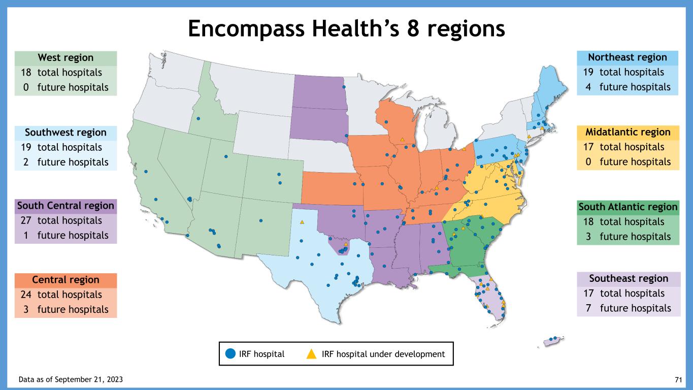 Encompass Health’s 8 regions Southwest region 19 total hospitals 2 future hospitals West region 18 total hospitals 0 future hospitals IRF hospital IRF hospital under development South Central region 27 total hospitals 1 future hospitals Southeast region 17 total hospitals 7 future hospitals South Atlantic region 18 total hospitals 3 future hospitals Central region 24 total hospitals 3 future hospitals Midatlantic region 17 total hospitals 0 future hospitals Northeast region 19 total hospitals 4 future hospitals Data as of September 21, 2023 71