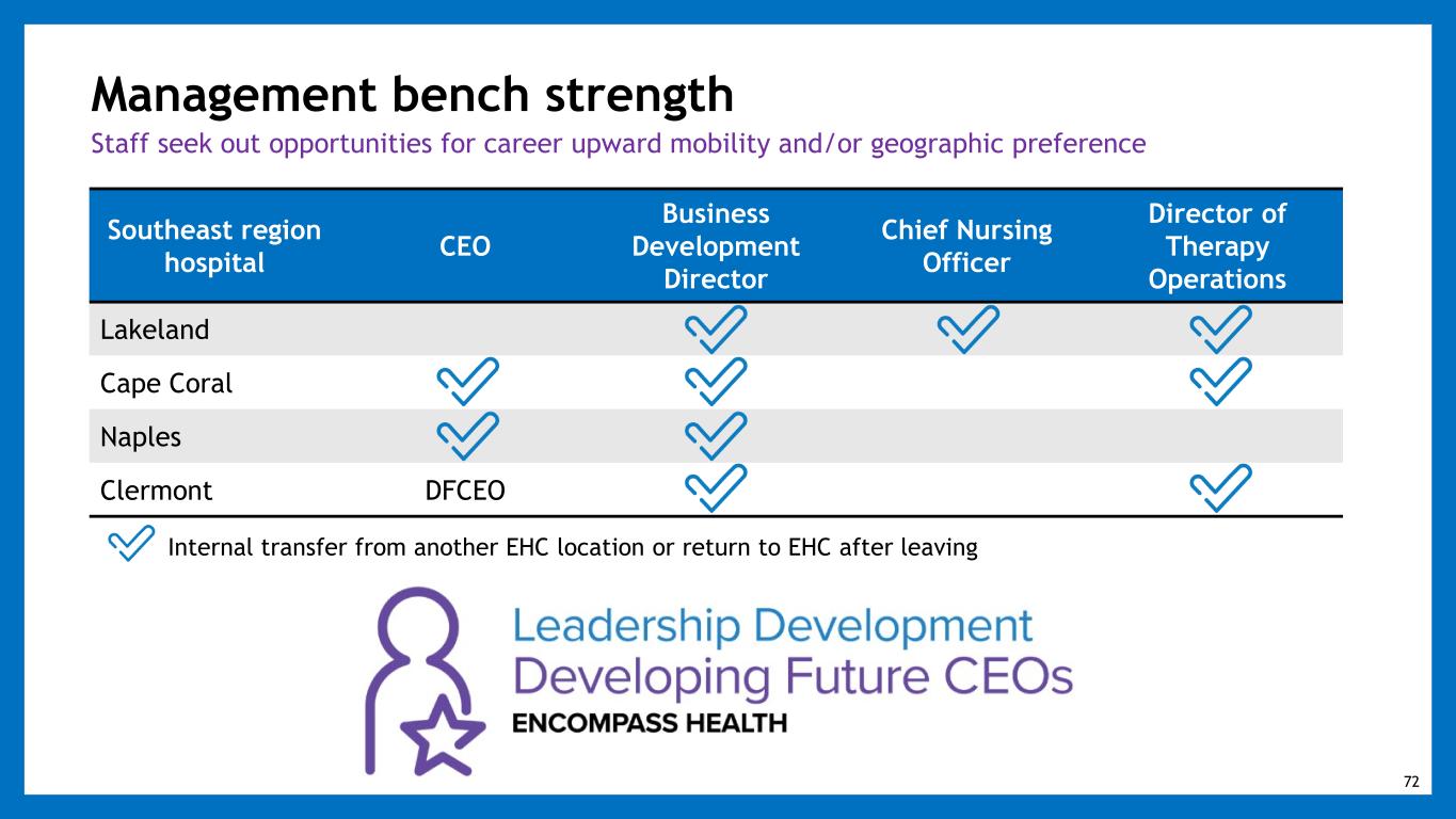 Southeast region hospital CEO Business Development Director Chief Nursing Officer Director of Therapy Operations Lakeland Cape Coral Naples Clermont DFCEO Management bench strength Staff seek out opportunities for career upward mobility and/or geographic preference Internal transfer from another EHC location or return to EHC after leaving 72