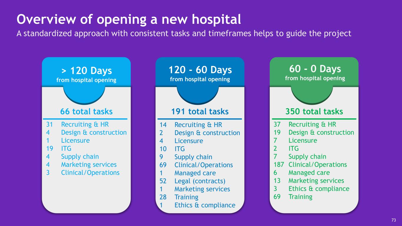 Overview of opening a new hospital A standardized approach with consistent tasks and timeframes helps to guide the project > 120 Days from hospital opening 31 Recruiting & HR 4 Design & construction 1 Licensure 19 ITG 4 Supply chain 4 Marketing services 3 Clinical/Operations 120 - 60 Days from hospital opening 60 - 0 Days from hospital opening 66 total tasks 14 Recruiting & HR 2 Design & construction 4 Licensure 10 ITG 9 Supply chain 69 Clinical/Operations 1 Managed care 52 Legal (contracts) 1 Marketing services 28 Training 1 Ethics & compliance 191 total tasks 37 Recruiting & HR 19 Design & construction 7 Licensure 2 ITG 7 Supply chain 187 Clinical/Operations 6 Managed care 13 Marketing services 3 Ethics & compliance 69 Training 350 total tasks 73