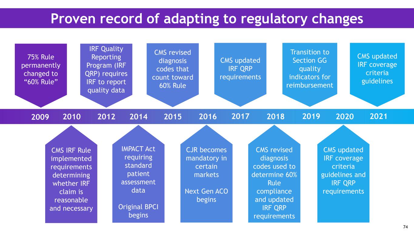 Proven record of adapting to regulatory changes 75% Rule permanently changed to “60% Rule” 2009 IRF Quality Reporting Program (IRF QRP) requires IRF to report quality data 2012 CMS IRF Rule implemented requirements determining whether IRF claim is reasonable and necessary 2010 2014 CJR becomes mandatory in certain markets Next Gen ACO begins 2016 IMPACT Act requiring standard patient assessment data Original BPCI begins CMS revised diagnosis codes that count toward 60% Rule 2015 CMS updated IRF QRP requirements 2017 Transition to Section GG quality indicators for reimbursement 2019 CMS revised diagnosis codes used to determine 60% Rule compliance and updated IRF QRP requirements 2018 CMS updated IRF coverage criteria guidelines and IRF QRP requirements 2020 CMS updated IRF coverage criteria guidelines 2021 74
