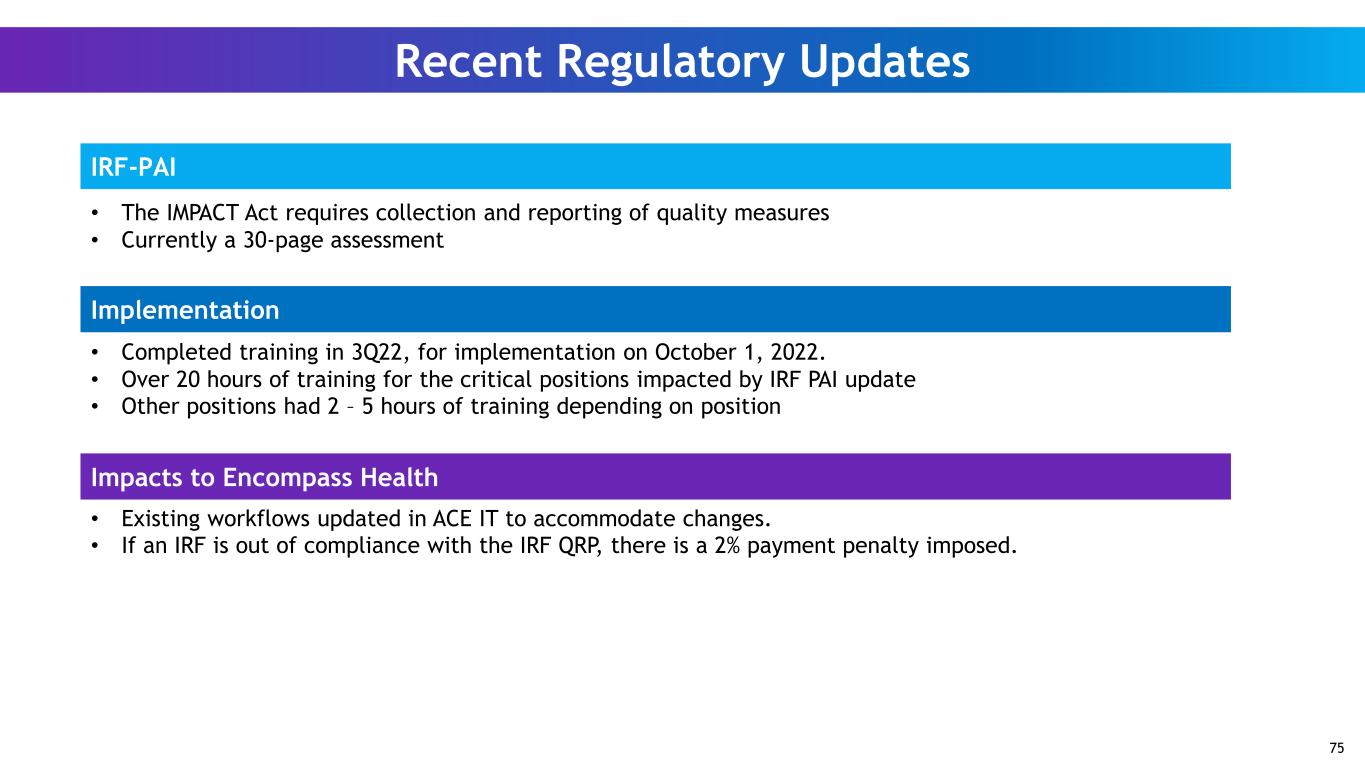Recent Regulatory Updates IRF-PAI Implementation Impacts to Encompass Health • The IMPACT Act requires collection and reporting of quality measures • Currently a 30-page assessment • Completed training in 3Q22, for implementation on October 1, 2022. • Over 20 hours of training for the critical positions impacted by IRF PAI update • Other positions had 2 – 5 hours of training depending on position • Existing workflows updated in ACE IT to accommodate changes. • If an IRF is out of compliance with the IRF QRP, there is a 2% payment penalty imposed. 75