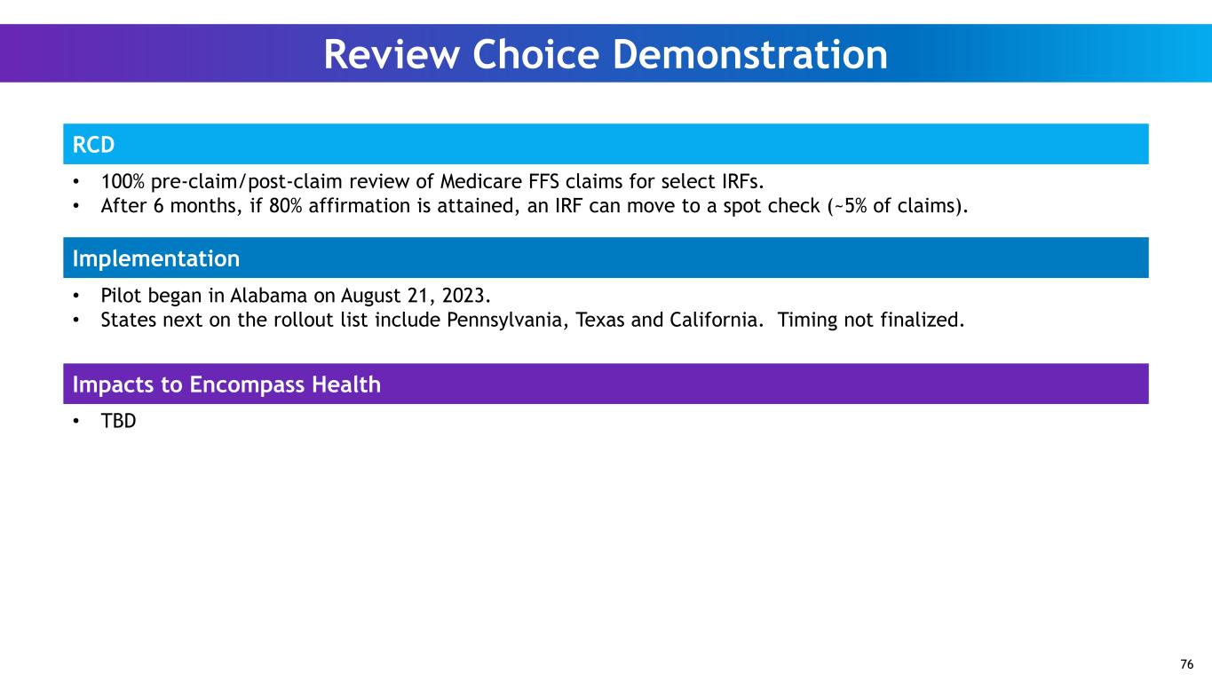Review Choice Demonstration RCD Impacts to Encompass Health • 100% pre-claim/post-claim review of Medicare FFS claims for select IRFs. • After 6 months, if 80% affirmation is attained, an IRF can move to a spot check (~5% of claims). • Pilot began in Alabama on August 21, 2023. • States next on the rollout list include Pennsylvania, Texas and California. Timing not finalized. Implementation • TBD 76