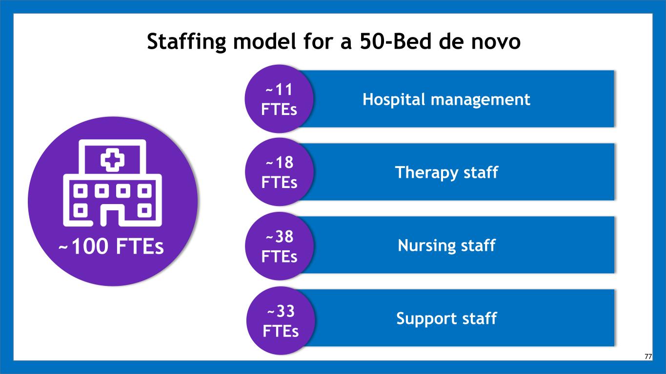 Staffing model for a 50-Bed de novo Hospital management Therapy staff Nursing staff Support staff ~11 FTEs ~18 FTEs ~38 FTEs ~33 FTEs ~100 FTEs 77