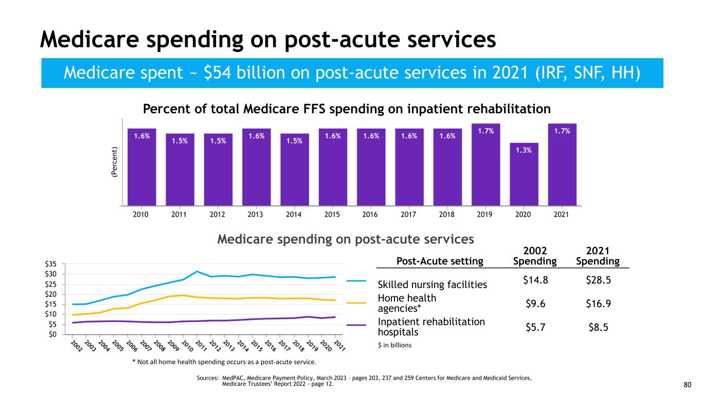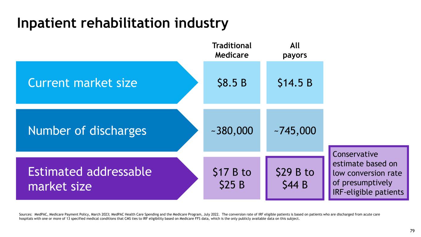 Sources: MedPAC, Medicare Payment Policy, March 2023; MedPAC Health Care Spending and the Medicare Program, July 2022. The conversion rate of IRF eligible patients is based on patients who are discharged from acute care hospitals with one or more of 13 specified medical conditions that CMS ties to IRF eligibility based on Medicare FFS data, which is the only publicly available data on this subject. Inpatient rehabilitation industry $8.5 B ~380,000 $17 B to $25 B Traditional Medicare All payors $14.5 B ~745,000 $29 B to $44 B Current market size Number of discharges Estimated addressable market size Conservative estimate based on low conversion rate of presumptively IRF-eligible patients 79
