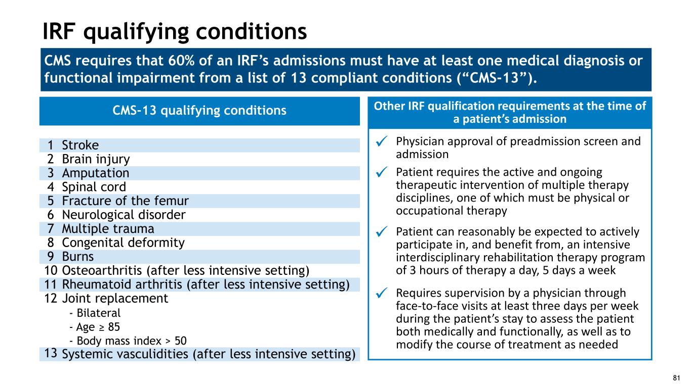 CMS requires that 60% of an IRF’s admissions must have at least one medical diagnosis or functional impairment from a list of 13 compliant conditions (“CMS-13”). IRF qualifying conditions CMS-13 qualifying conditions 1 Stroke 2 Brain injury 3 Amputation 4 Spinal cord 5 Fracture of the femur 6 Neurological disorder 7 Multiple trauma 8 Congenital deformity 9 Burns 10 Osteoarthritis (after less intensive setting) 11 Rheumatoid arthritis (after less intensive setting) 12 Joint replacement - Bilateral - Age ≥ 85 - Body mass index > 50 13 Systemic vasculidities (after less intensive setting) Other IRF qualification requirements at the time of a patient’s admission  Physician approval of preadmission screen and admission  Patient requires the active and ongoing therapeutic intervention of multiple therapy disciplines, one of which must be physical or occupational therapy  Patient can reasonably be expected to actively participate in, and benefit from, an intensive interdisciplinary rehabilitation therapy program of 3 hours of therapy a day, 5 days a week  Requires supervision by a physician through face-to-face visits at least three days per week during the patient’s stay to assess the patient both medically and functionally, as well as to modify the course of treatment as needed 81