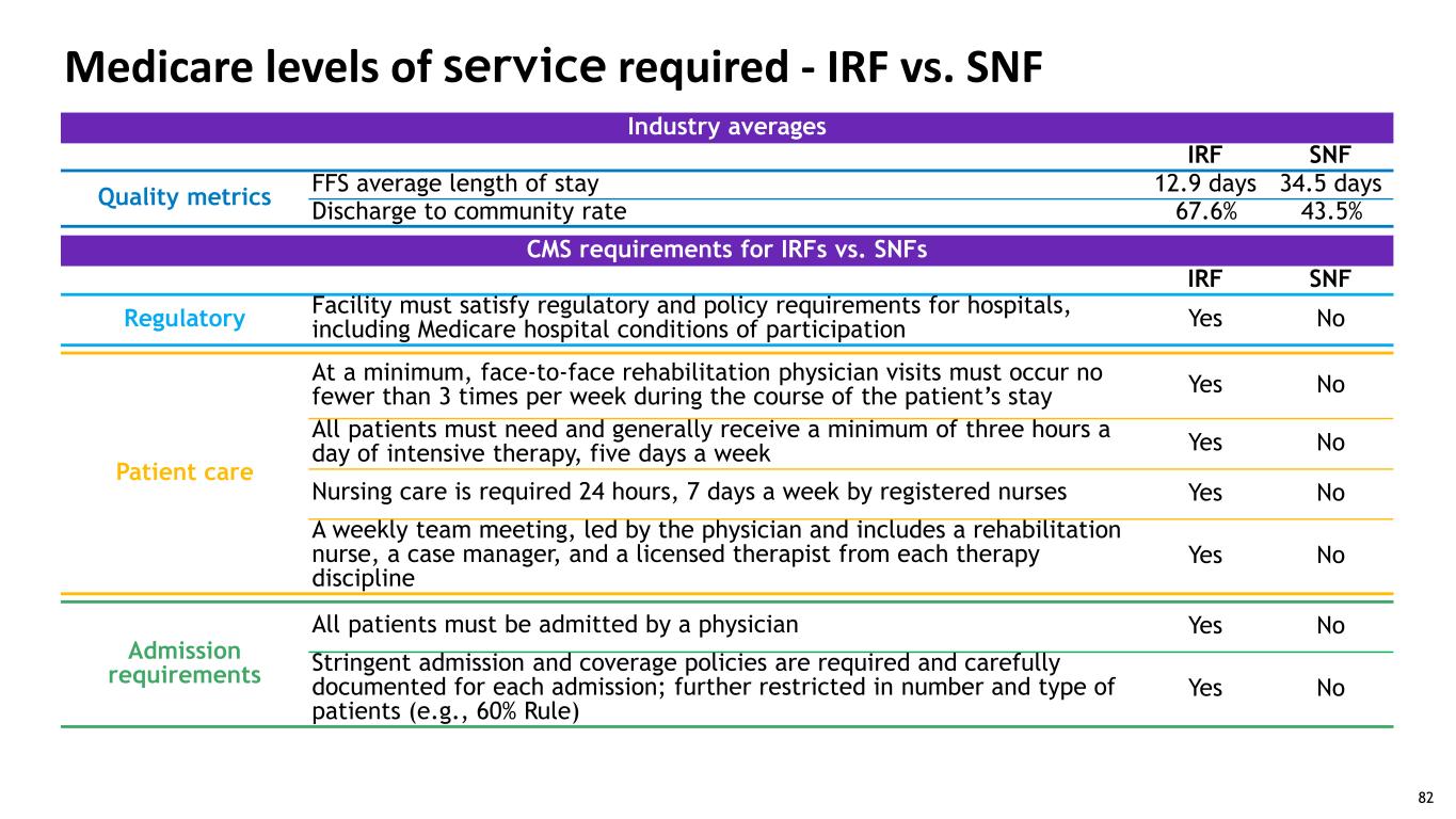 Medicare levels of service required - IRF vs. SNF Industry averages IRF SNF Quality metrics FFS average length of stay 12.9 days 34.5 days Discharge to community rate 67.6% 43.5% CMS requirements for IRFs vs. SNFs IRF SNF Regulatory Facility must satisfy regulatory and policy requirements for hospitals, including Medicare hospital conditions of participation Yes No Patient care At a minimum, face-to-face rehabilitation physician visits must occur no fewer than 3 times per week during the course of the patient’s stay Yes No All patients must need and generally receive a minimum of three hours a day of intensive therapy, five days a week Yes No Nursing care is required 24 hours, 7 days a week by registered nurses Yes No A weekly team meeting, led by the physician and includes a rehabilitation nurse, a case manager, and a licensed therapist from each therapy discipline Yes No Admission requirements All patients must be admitted by a physician Yes No Stringent admission and coverage policies are required and carefully documented for each admission; further restricted in number and type of patients (e.g., 60% Rule) Yes No Source: MedPAC, Medicare Payment Policy, March 2023 - pages 214, 222, 266 and 267. 82