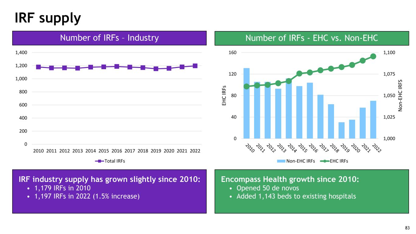 IRF industry supply has grown slightly since 2010: • 1,179 IRFs in 2010 • 1,197 IRFs in 2022 (1.5% increase) Number of IRFs – Industry IRF supply Number of IRFs - EHC vs. Non-EHC 83 0 200 400 600 800 1,000 1,200 1,400 2010 2011 2012 2013 2014 2015 2016 2017 2018 2019 2020 2021 2022 Total IRFs 1,000 1,025 1,050 1,075 1,100 0 40 80 120 160 N on -E HC IR FS EH C IR Fs Non-EHC IRFs EHC IRFs Encompass Health growth since 2010: • Opened 50 de novos • Added 1,143 beds to existing hospitals