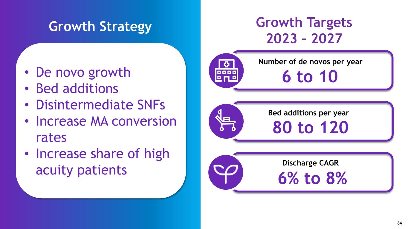 Growth Strategy Number of de novos per year 6 to 10 Bed additions per year 80 to 120 6% to 8% Discharge CAGR Growth Targets 2023 – 2027 • De novo growth • Bed additions • Disintermediate SNFs • Increase MA conversion rates • Increase share of high acuity patients 84