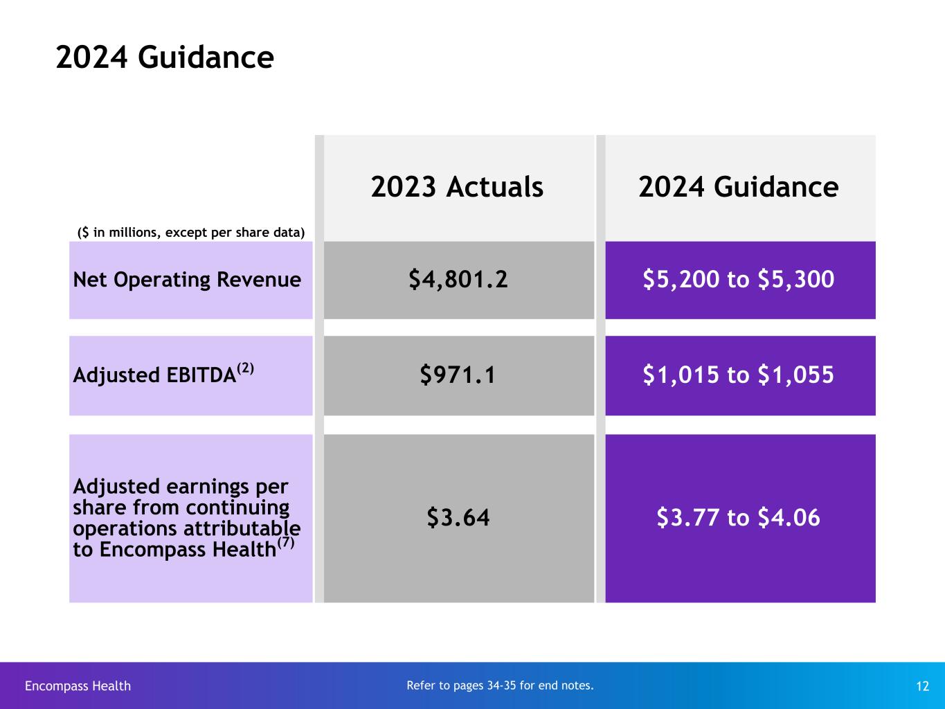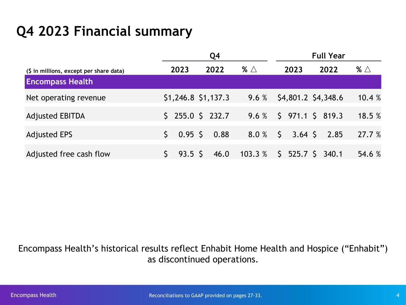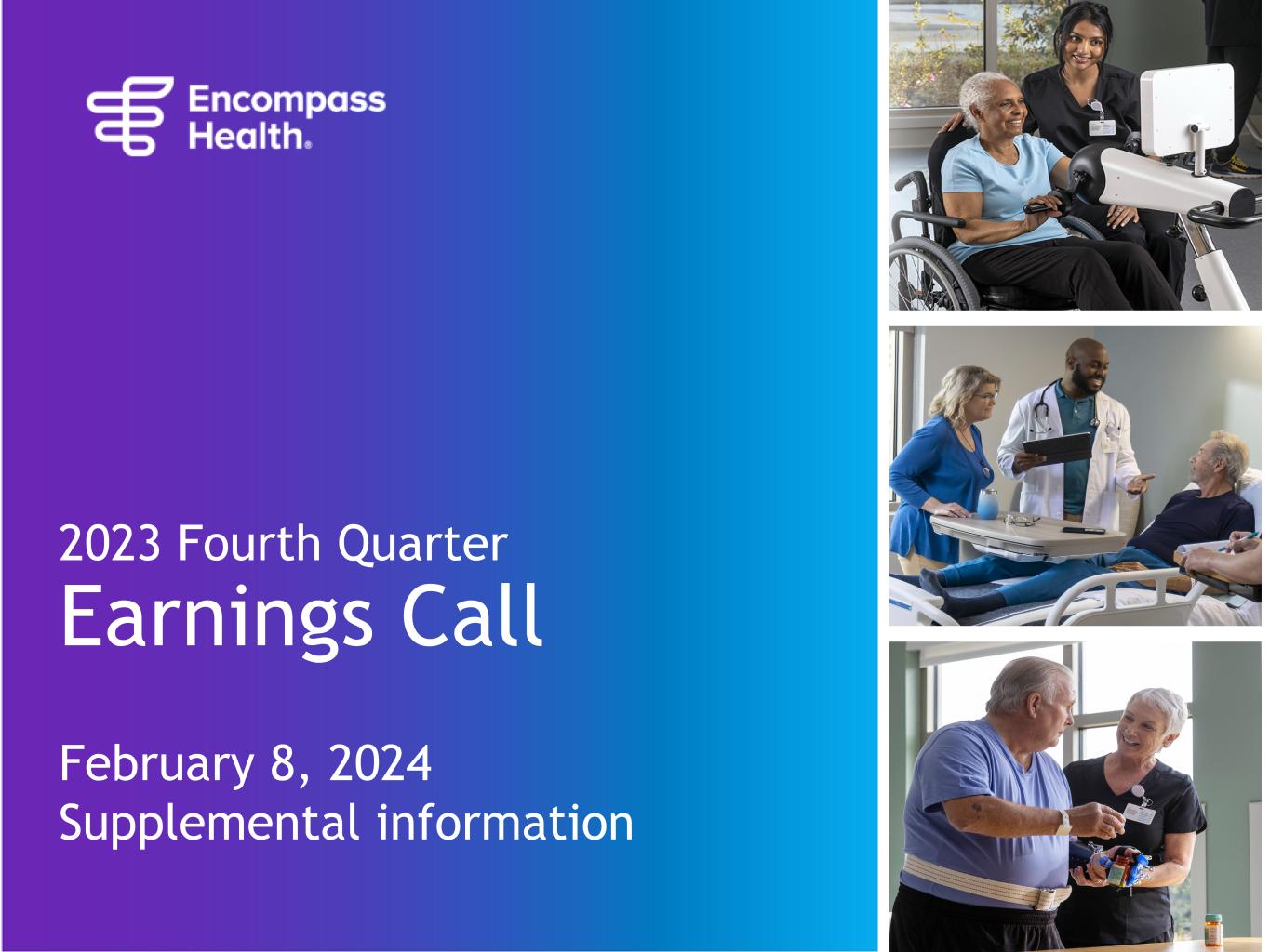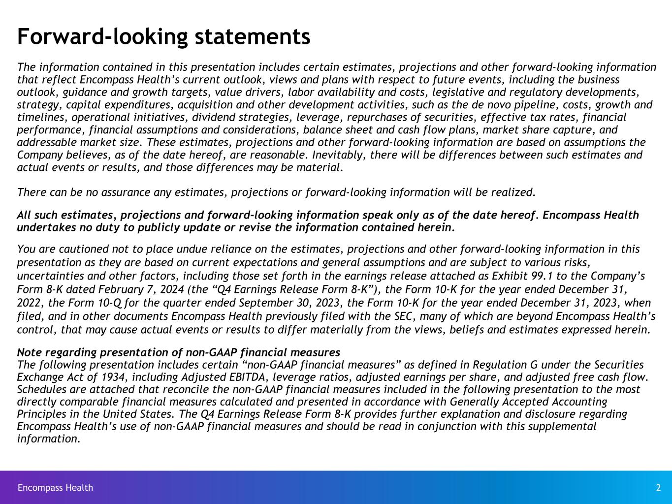 Encompass Health 2 The information contained in this presentation includes certain estimates, projections and other forward-looking information that reflect Encompass Health’s current outlook, views and plans with respect to future events, including the business outlook, guidance and growth targets, value drivers, labor availability and costs, legislative and regulatory developments, strategy, capital expenditures, acquisition and other development activities, such as the de novo pipeline, costs, growth and timelines, operational initiatives, dividend strategies, leverage, repurchases of securities, effective tax rates, financial performance, financial assumptions and considerations, balance sheet and cash flow plans, market share capture, and addressable market size. These estimates, projections and other forward-looking information are based on assumptions the Company believes, as of the date hereof, are reasonable. Inevitably, there will be differences between such estimates and actual events or results, and those differences may be material. There can be no assurance any estimates, projections or forward-looking information will be realized. All such estimates, projections and forward-looking information speak only as of the date hereof. Encompass Health undertakes no duty to publicly update or revise the information contained herein. You are cautioned not to place undue reliance on the estimates, projections and other forward-looking information in this presentation as they are based on current expectations and general assumptions and are subject to various risks, uncertainties and other factors, including those set forth in the earnings release attached as Exhibit 99.1 to the Company’s Form 8-K dated February 7, 2024 (the “Q4 Earnings Release Form 8-K”), the Form 10-K for the year ended December 31, 2022, the Form 10-Q for the quarter ended September 30, 2023, the Form 10-K for the year ended December 31, 2023, when filed, and in other documents Encompass Health previously filed with the SEC, many of which are beyond Encompass Health’s control, that may cause actual events or results to differ materially from the views, beliefs and estimates expressed herein. Note regarding presentation of non-GAAP financial measures The following presentation includes certain “non-GAAP financial measures” as defined in Regulation G under the Securities Exchange Act of 1934, including Adjusted EBITDA, leverage ratios, adjusted earnings per share, and adjusted free cash flow. Schedules are attached that reconcile the non-GAAP financial measures included in the following presentation to the most directly comparable financial measures calculated and presented in accordance with Generally Accepted Accounting Principles in the United States. The Q4 Earnings Release Form 8-K provides further explanation and disclosure regarding Encompass Health’s use of non-GAAP financial measures and should be read in conjunction with this supplemental information. Forward-looking statements