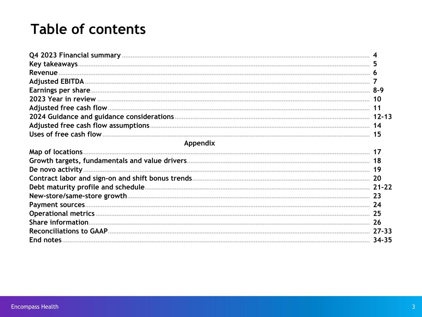 Encompass Health 3 Q4 2023 Financial summary ............................................................................................................................................. 4 Key takeaways ...................................................................................................................................................................... 5 Revenue ................................................................................................................................................................................. 6 Adjusted EBITDA .................................................................................................................................................................. 7 Earnings per share ............................................................................................................................................................... 8-9 2023 Year in review ........................................................................................................................................................... 10 Adjusted free cash flow ..................................................................................................................................................... 11 2024 Guidance and guidance considerations ............................................................................................................... 12-13 Adjusted free cash flow assumptions ............................................................................................................................. 14 Uses of free cash flow ........................................................................................................................................................ 15 Appendix Map of locations ................................................................................................................................................................... 17 Growth targets, fundamentals and value drivers ........................................................................................................ 18 De novo activity ................................................................................................................................................................... 19 Contract labor and sign-on and shift bonus trends ..................................................................................................... 20 Debt maturity profile and schedule ................................................................................................................................ 21-22 New-store/same-store growth .......................................................................................................................................... 23 Payment sources .................................................................................................................................................................. 24 Operational metrics ............................................................................................................................................................ 25 Share information ................................................................................................................................................................ 26 Reconciliations to GAAP ..................................................................................................................................................... 27-33 End notes ............................................................................................................................................................................... 34-35 Table of contents