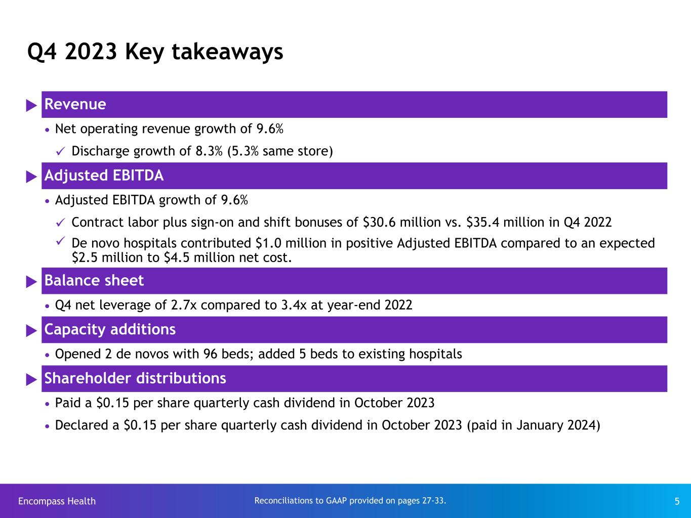 Encompass Health 4 Q4 2023 Financial summary Q4 Full Year ($ in millions, except per share data) 2023 2022 % △ 2023 2022 % △ Encompass Health Net operating revenue $ 1,246.8 $ 1,137.3 9.6 % $ 4,801.2 $ 4,348.6 10.4 % Adjusted EBITDA $ 255.0 $ 232.7 9.6 % $ 971.1 $ 819.3 18.5 % Adjusted EPS $ 0.95 $ 0.88 8.0 % $ 3.64 $ 2.85 27.7 % Adjusted free cash flow $ 93.5 $ 46.0 103.3 % $ 525.7 $ 340.1 54.6 % Reconciliations to GAAP provided on pages 27-33. Encompass Health’s historical results reflect Enhabit Home Health and Hospice (“Enhabit”) as discontinued operations.