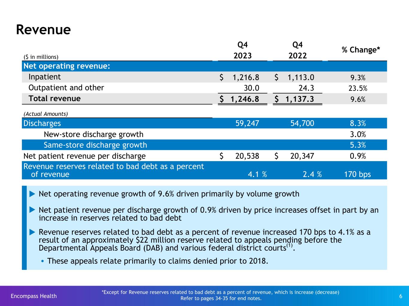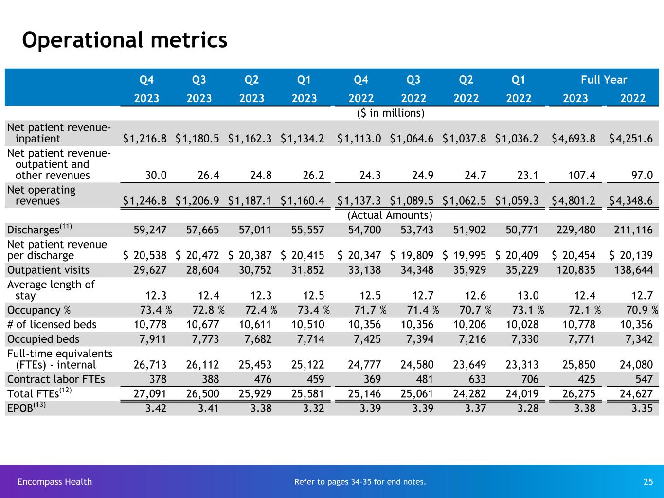 Encompass Health 25 Operational metrics Q4 Q3 Q2 Q1 Q4 Q3 Q2 Q1 Full Year 2023 2023 2023 2023 2022 2022 2022 2022 2023 2022 ($ in millions) Net patient revenue- inpatient $ 1,216.8 $ 1,180.5 $ 1,162.3 $ 1,134.2 $ 1,113.0 $ 1,064.6 $ 1,037.8 $ 1,036.2 $ 4,693.8 $ 4,251.6 Net patient revenue- outpatient and other revenues 30.0 26.4 24.8 26.2 24.3 24.9 24.7 23.1 107.4 97.0 Net operating revenues $ 1,246.8 $ 1,206.9 $ 1,187.1 $ 1,160.4 $ 1,137.3 $ 1,089.5 $ 1,062.5 $ 1,059.3 $ 4,801.2 $ 4,348.6 (Actual Amounts) Discharges(11) 59,247 57,665 57,011 55,557 54,700 53,743 51,902 50,771 229,480 211,116 Net patient revenue per discharge $ 20,538 $ 20,472 $ 20,387 $ 20,415 $ 20,347 $ 19,809 $ 19,995 $ 20,409 $ 20,454 $ 20,139 Outpatient visits 29,627 28,604 30,752 31,852 33,138 34,348 35,929 35,229 120,835 138,644 Average length of stay 12.3 12.4 12.3 12.5 12.5 12.7 12.6 13.0 12.4 12.7 Occupancy % 73.4 % 72.8 % 72.4 % 73.4 % 71.7 % 71.4 % 70.7 % 73.1 % 72.1 % 70.9 % # of licensed beds 10,778 10,677 10,611 10,510 10,356 10,356 10,206 10,028 10,778 10,356 Occupied beds 7,911 7,773 7,682 7,714 7,425 7,394 7,216 7,330 7,771 7,342 Full-time equivalents (FTEs) - internal 26,713 26,112 25,453 25,122 24,777 24,580 23,649 23,313 25,850 24,080 Contract labor FTEs 378 388 476 459 369 481 633 706 425 547 Total FTEs(12) 27,091 26,500 25,929 25,581 25,146 25,061 24,282 24,019 26,275 24,627 EPOB(13) 3.42 3.41 3.38 3.32 3.39 3.39 3.37 3.28 3.38 3.35 Refer to pages 34-35 for end notes.
