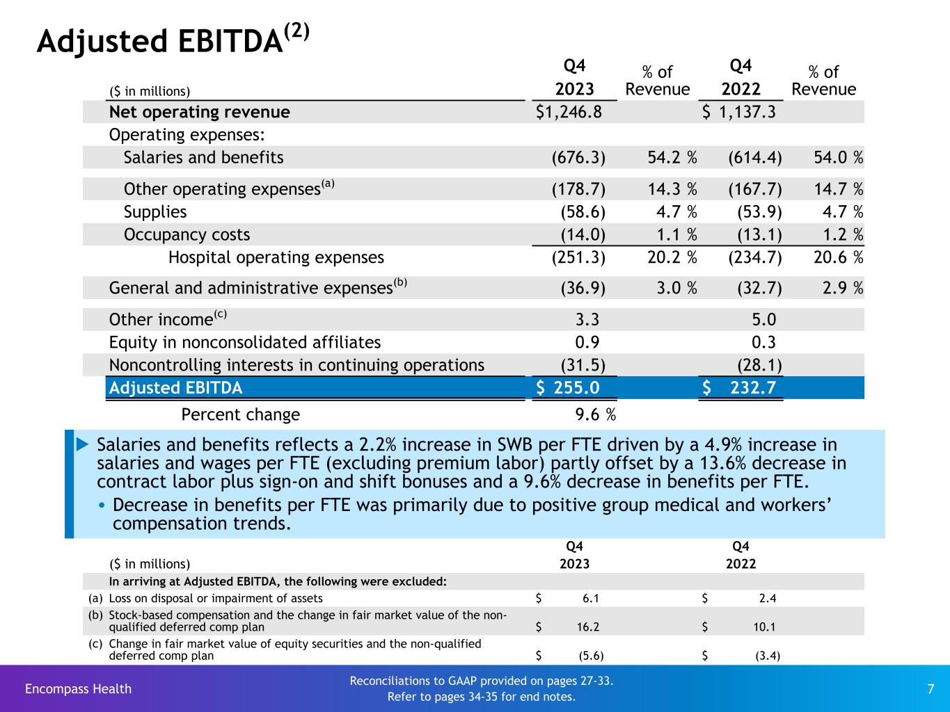 Encompass Health 6 Revenue Q4 Q4 % Change* ($ in millions) 2023 2022 Net operating revenue: Inpatient $ 1,216.8 $ 1,113.0 9.3% Outpatient and other 30.0 24.3 23.5% Total revenue $ 1,246.8 $ 1,137.3 9.6% (Actual Amounts) Discharges 59,247 54,700 8.3% New-store discharge growth 3.0% Same-store discharge growth 5.3% Net patient revenue per discharge $ 20,538 $ 20,347 0.9% Revenue reserves related to bad debt as a percent of revenue 4.1 % 2.4 % 170 bps u Net operating revenue growth of 9.6% driven primarily by volume growth u Net patient revenue per discharge growth of 0.9% driven by price increases offset in part by an increase in reserves related to bad debt u Revenue reserves related to bad debt as a percent of revenue increased 170 bps to 4.1% as a result of an approximately $22 million reserve related to appeals pending before the Departmental Appeals Board (DAB) and various federal district courts(1). Ÿ These appeals relate primarily to claims denied prior to 2018. *Except for Revenue reserves related to bad debt as a percent of revenue, which is increase (decrease) Refer to pages 34-35 for end notes.