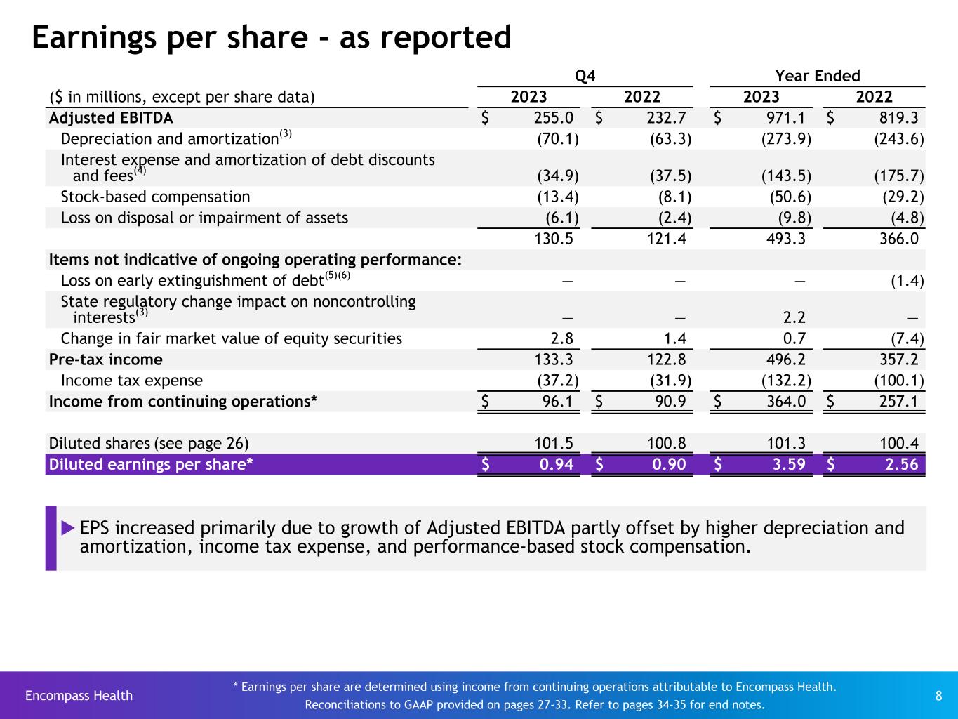 Encompass Health 7 Adjusted EBITDA(2) Q4 % of Revenue Q4 % of Revenue($ in millions) 2023 2022 Net operating revenue $ 1,246.8 $ 1,137.3 Operating expenses: Salaries and benefits (676.3) 54.2 % (614.4) 54.0 % Other operating expenses(a) (178.7) 14.3 % (167.7) 14.7 % Supplies (58.6) 4.7 % (53.9) 4.7 % Occupancy costs (14.0) 1.1 % (13.1) 1.2 % Hospital operating expenses (251.3) 20.2 % (234.7) 20.6 % General and administrative expenses(b) (36.9) 3.0 % (32.7) 2.9 % Other income(c) 3.3 5.0 Equity in nonconsolidated affiliates 0.9 0.3 Noncontrolling interests in continuing operations (31.5) (28.1) Adjusted EBITDA $ 255.0 $ 232.7 Percent change 9.6 % Q4 Q4 ($ in millions) 2023 2022 In arriving at Adjusted EBITDA, the following were excluded: (a) Loss on disposal or impairment of assets $ 6.1 $ 2.4 (b) Stock-based compensation and the change in fair market value of the non- qualified deferred comp plan $ 16.2 $ 10.1 (c) Change in fair market value of equity securities and the non-qualified deferred comp plan $ (5.6) $ (3.4) u Salaries and benefits reflects a 2.2% increase in SWB per FTE driven by a 4.9% increase in salaries and wages per FTE (excluding premium labor) partly offset by a 13.6% decrease in contract labor plus sign-on and shift bonuses and a 9.6% decrease in benefits per FTE. Ÿ Decrease in benefits per FTE was primarily due to positive group medical and workers’ compensation trends. Reconciliations to GAAP provided on pages 27-33. Refer to pages 34-35 for end notes.